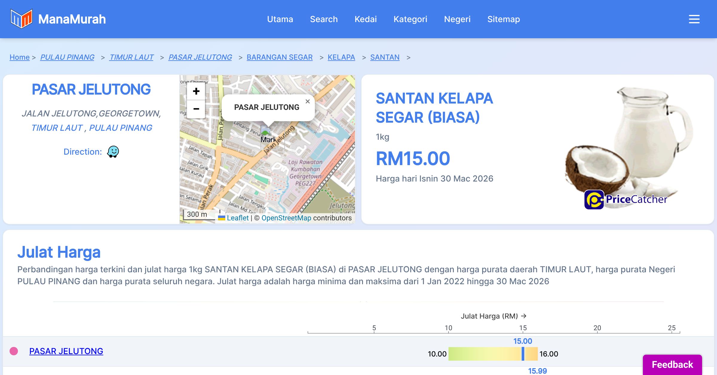 Perbandingan harga terkini dan julat harga 1kg SANTAN KELAPA SEGAR (BIASA) di PASAR JELUTONG dengan harga purata daerah TIMUR LAUT, harga purata Negeri PULAU PINANG dan harga purata seluruh negara. Julat harga adalah harga minima dan maksima dari 1 Jan 2022 hingga 30 Mac 2026