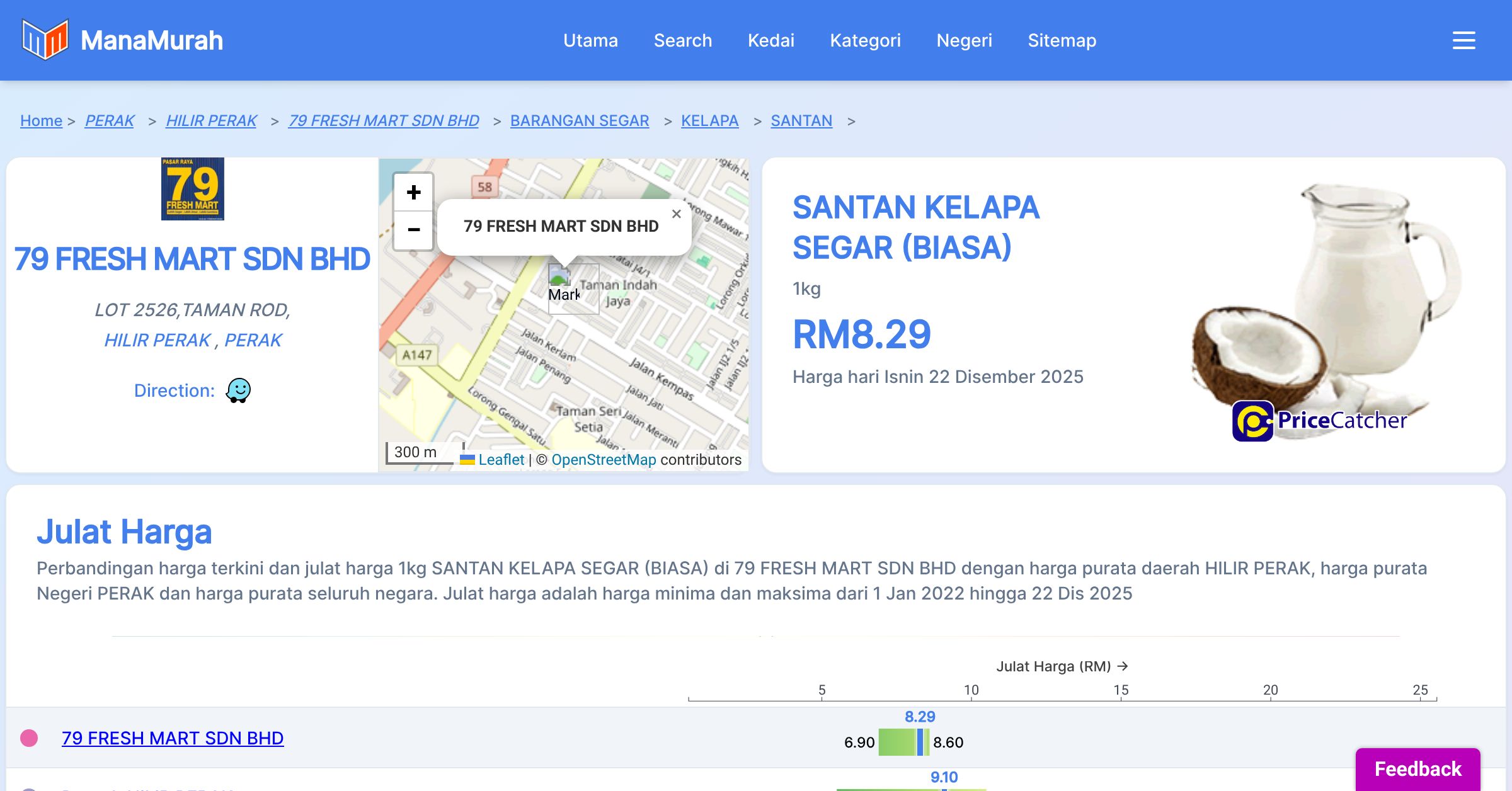 Perbandingan harga terkini dan julat harga 1kg SANTAN KELAPA SEGAR (BIASA) di 79 FRESH MART SDN BHD dengan harga purata daerah HILIR PERAK, harga purata Negeri PERAK dan harga purata seluruh negara. Julat harga adalah harga minima dan maksima dari 1 Jan 2022 hingga 22 Dis 2025