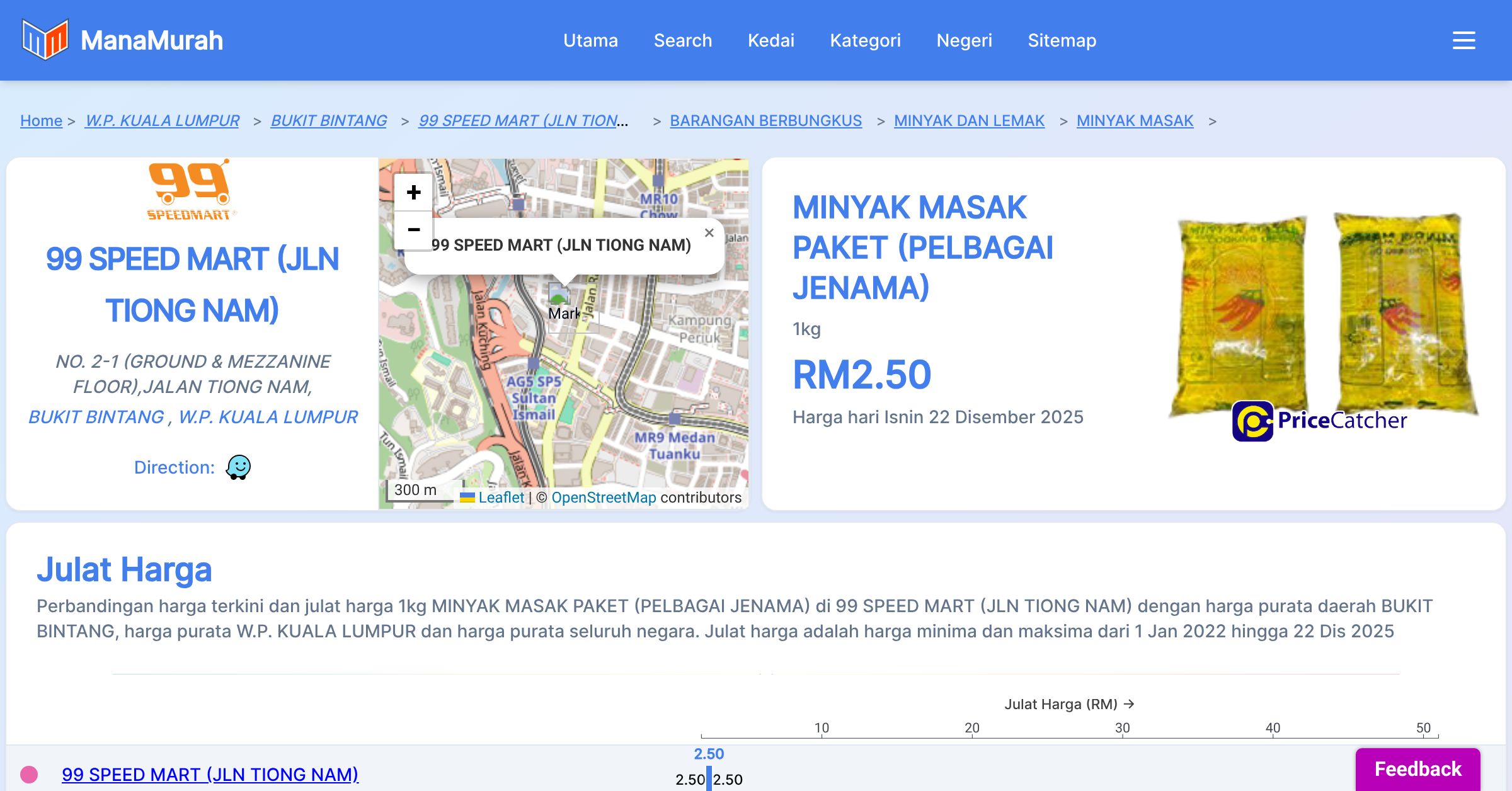 Perubahan harga purata mingguan 1kg MINYAK MASAK PAKET (PELBAGAI JENAMA) di 99 SPEED MART (JLN TIONG NAM) berbanding harga purata mingguan daerah BUKIT BINTANG, harga purata mingguan negeri W.P. KUALA LUMPUR dan harga purata mingguan seluruh negara sehingga 22 Dis 2025
