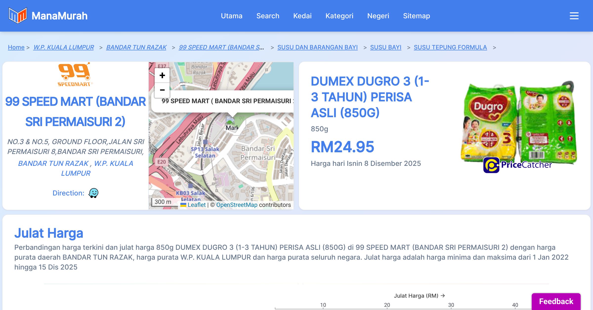 Perubahan harga purata mingguan 850g DUMEX DUGRO 3 (1-3 TAHUN) PERISA ASLI (850G) di 99 SPEED MART ( BANDAR SRI PERMAISURI 2 ) berbanding harga purata mingguan daerah BANDAR TUN RAZAK, harga purata mingguan negeri W.P. KUALA LUMPUR dan harga purata mingguan seluruh negara sehingga 8 Dis 2025
