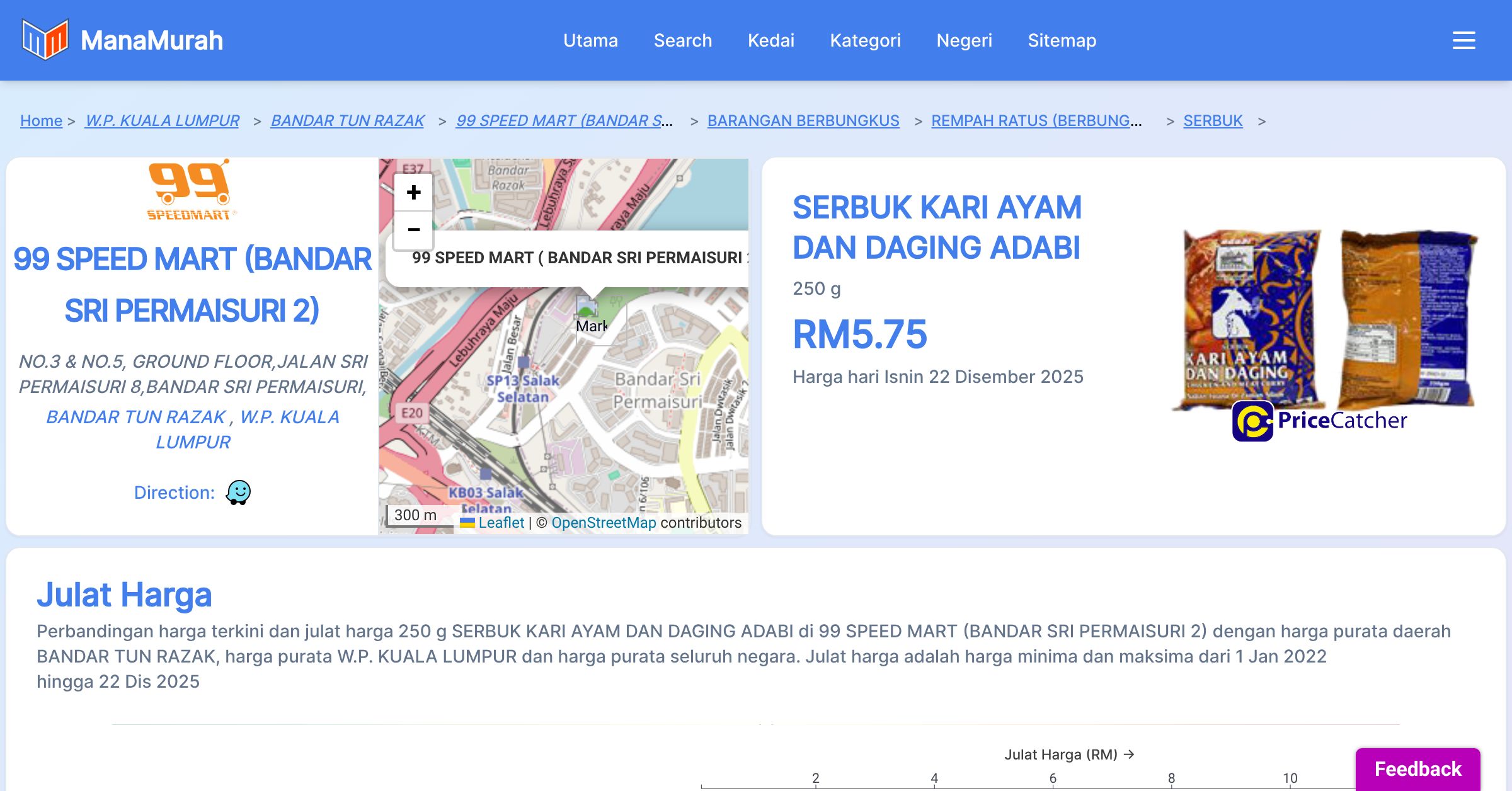 Perubahan harga purata mingguan 250 g SERBUK KARI AYAM DAN DAGING ADABI di 99 SPEED MART ( BANDAR SRI PERMAISURI 2 ) berbanding harga purata mingguan daerah BANDAR TUN RAZAK, harga purata mingguan negeri W.P. KUALA LUMPUR dan harga purata mingguan seluruh negara sehingga 22 Dis 2025