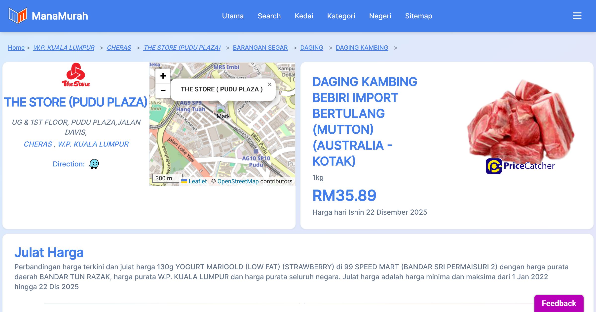 Tiada maklumat harga DAGING KAMBING BEBIRI IMPORT BERTULANG (MUTTON) (AUSTRALIA - KOTAK) di CHERAS pada minggu ke-52 tahun 2025 dari 22 Disember 2025
