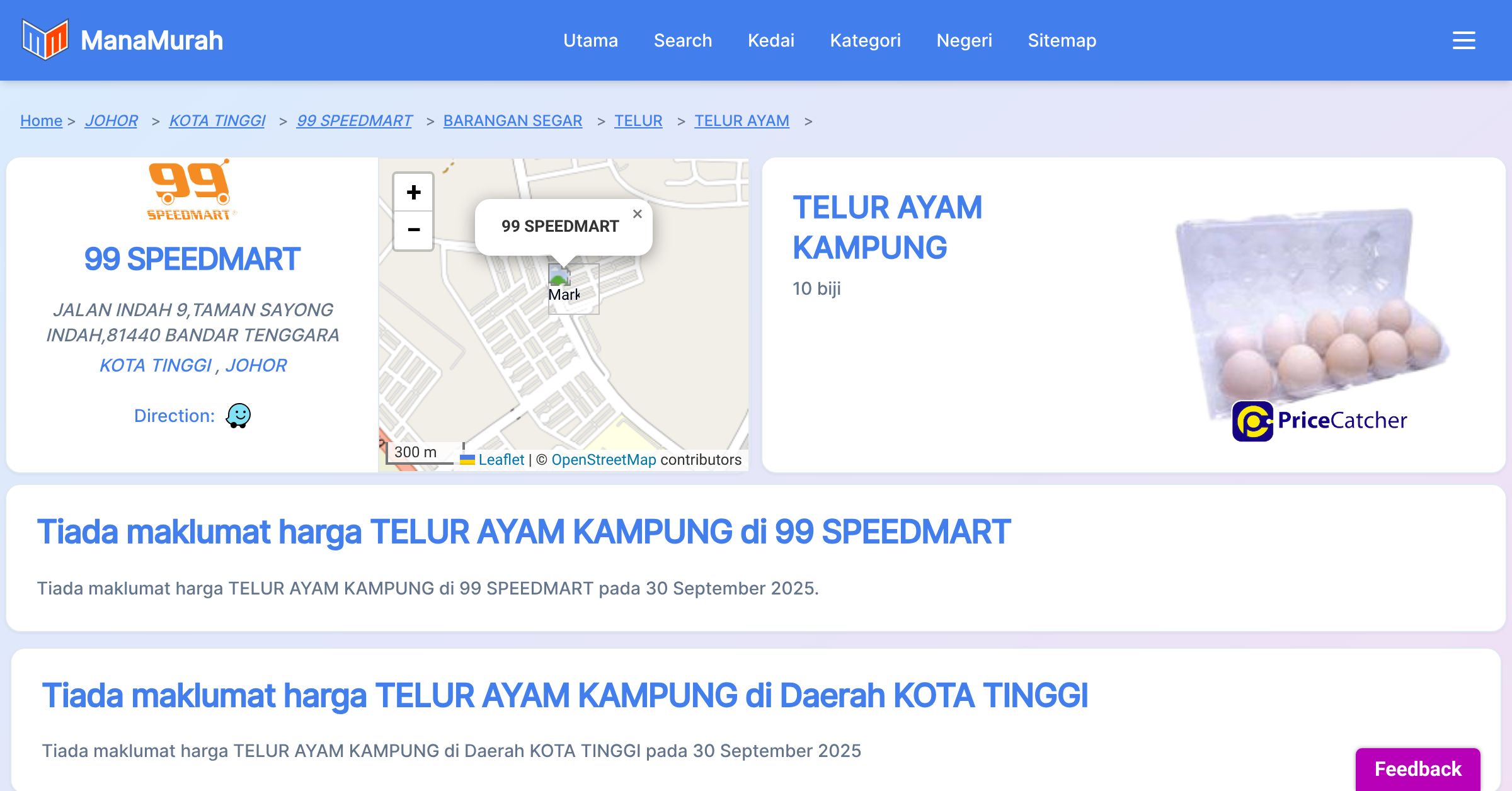 Perbandingan harga terkini dan julat harga 10 biji TELUR AYAM KAMPUNG di 99 SPEEDMART dengan harga purata daerah KOTA TINGGI, harga purata Negeri JOHOR dan harga purata seluruh negara. Julat harga adalah harga minima dan maksima dari 1 Jan 2022 hingga 17 Jul 2025