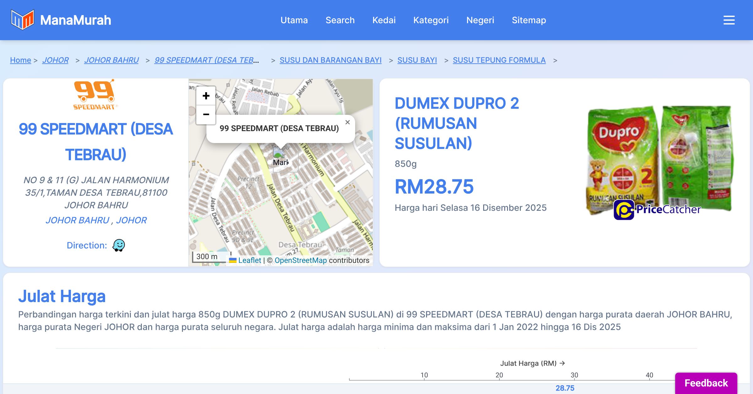 Perubahan harga purata mingguan 850g DUMEX DUPRO 2 (RUMUSAN SUSULAN) di 99 SPEEDMART (DESA TEBRAU) berbanding harga purata mingguan daerah JOHOR BAHRU, harga purata mingguan negeri JOHOR dan harga purata mingguan seluruh negara sehingga 16 Dis 2025
