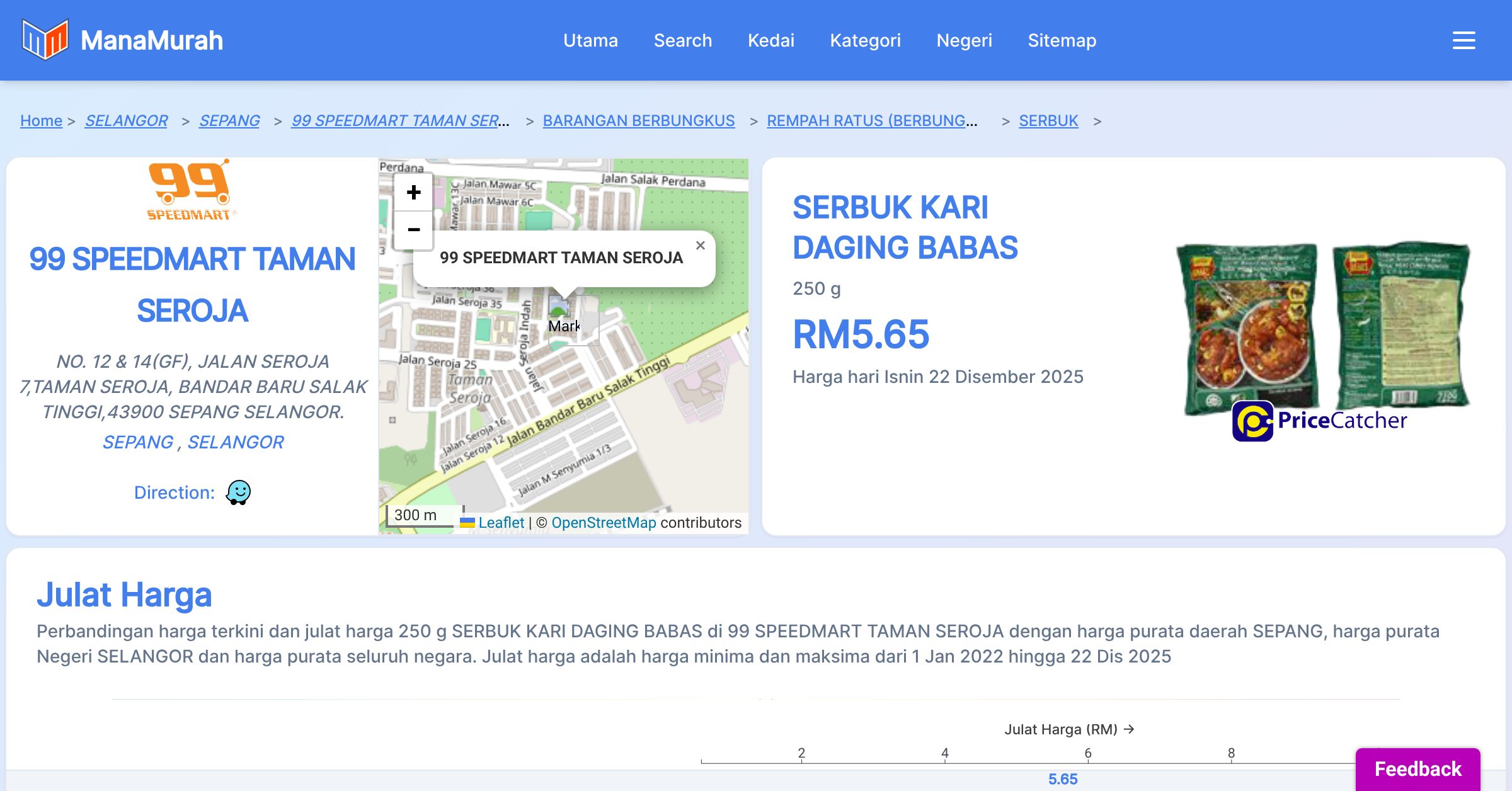 Perubahan harga purata mingguan 250 g SERBUK KARI DAGING BABAS di 99 SPEEDMART TAMAN SEROJA berbanding harga purata mingguan daerah SEPANG, harga purata mingguan negeri SELANGOR dan harga purata mingguan seluruh negara sehingga 22 Dis 2025