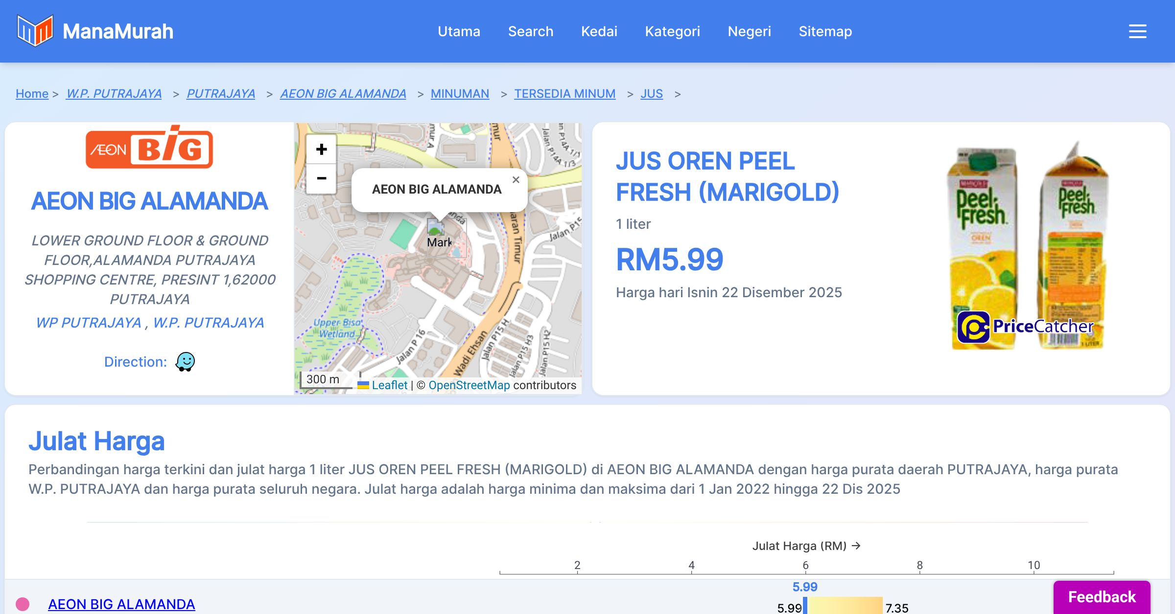 Perubahan harga purata mingguan 1 liter JUS OREN PEEL FRESH (MARIGOLD) di AEON BIG ALAMANDA berbanding harga purata mingguan daerah WP PUTRAJAYA, harga purata mingguan negeri W.P. PUTRAJAYA dan harga purata mingguan seluruh negara sehingga 22 Dis 2025