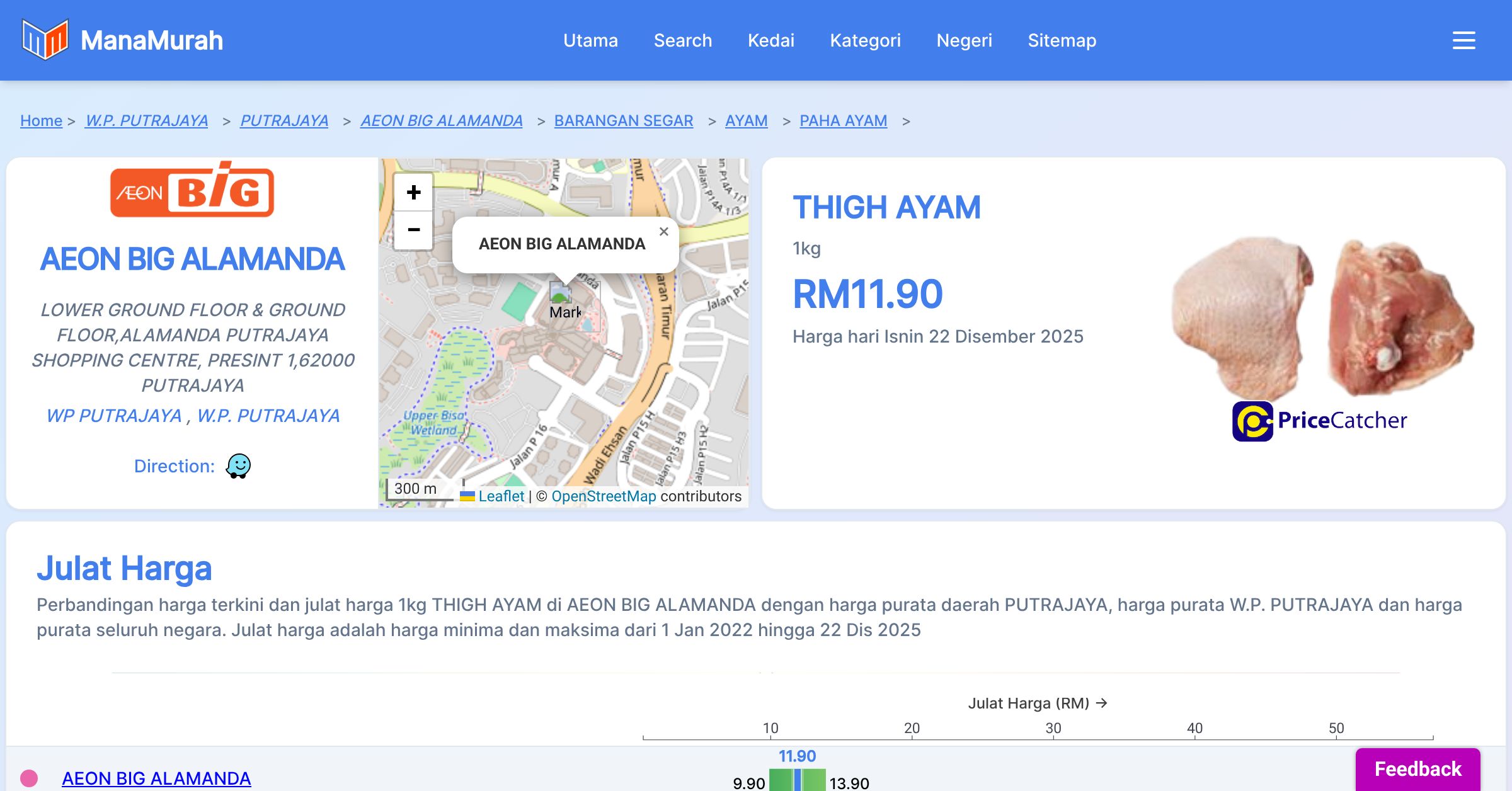 Perubahan harga purata mingguan 1kg THIGH AYAM di AEON BIG ALAMANDA berbanding harga purata mingguan daerah WP PUTRAJAYA, harga purata mingguan negeri W.P. PUTRAJAYA dan harga purata mingguan seluruh negara sehingga 22 Dis 2025