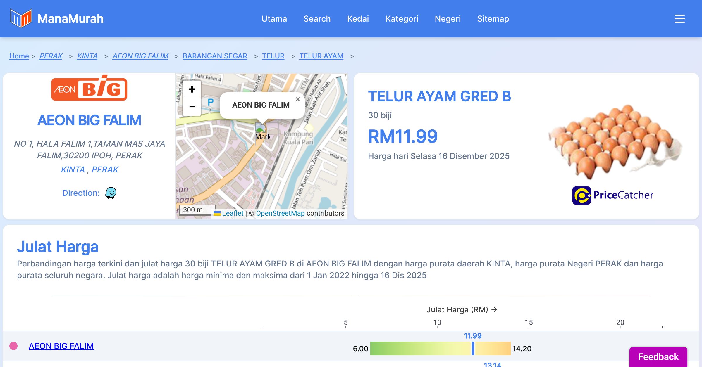 Perbandingan harga terkini dan julat harga 30 biji TELUR AYAM GRED B di AEON BIG FALIM dengan harga purata daerah KINTA, harga purata Negeri PERAK dan harga purata seluruh negara. Julat harga adalah harga minima dan maksima dari 1 Jan 2022 hingga 15 Dis 2025