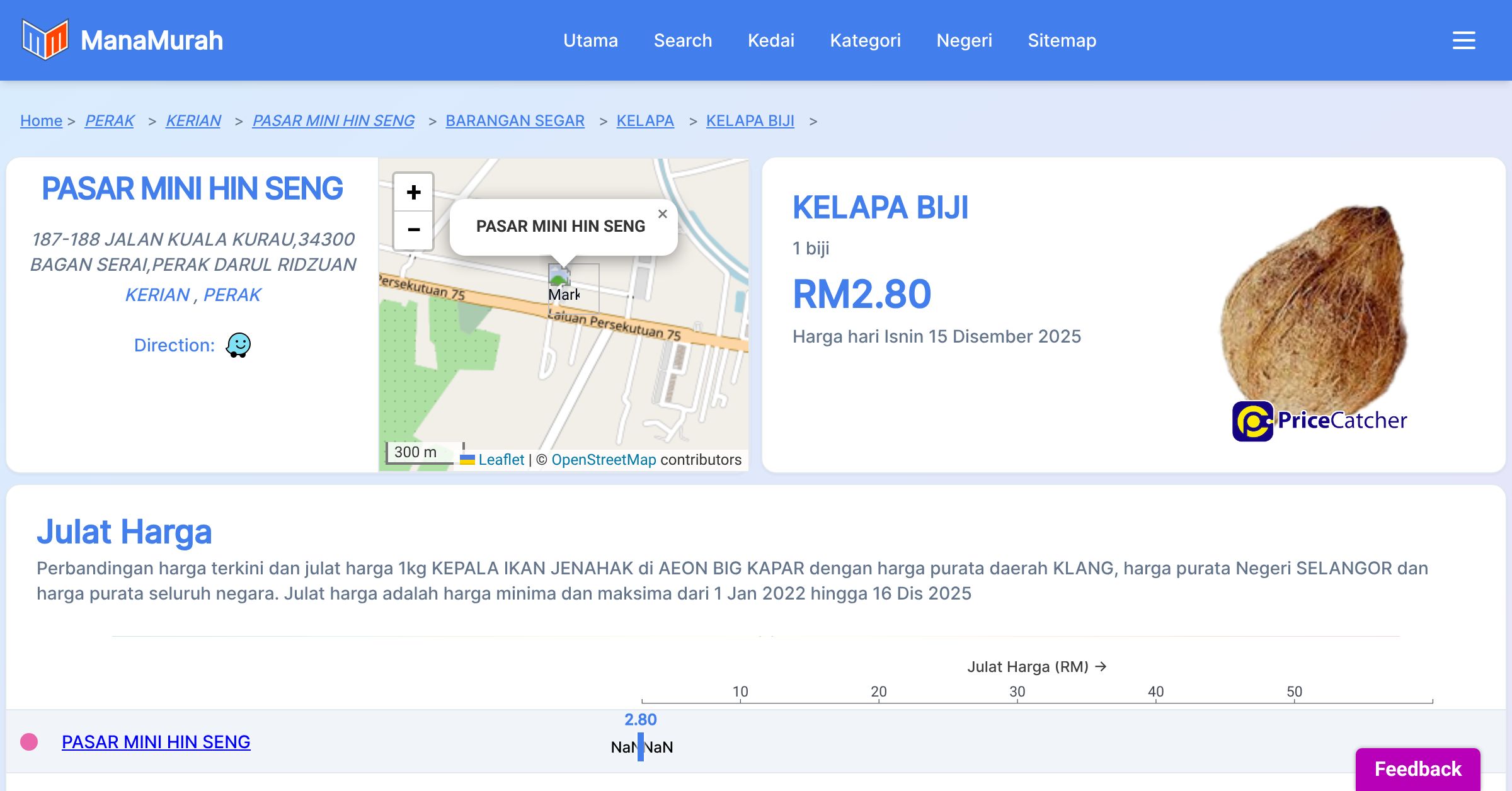 Perbandingan harga terkini dan julat harga 1kg KEPALA IKAN JENAHAK di AEON BIG KAPAR dengan harga purata daerah KLANG, harga purata Negeri SELANGOR dan harga purata seluruh negara. Julat harga adalah harga minima dan maksima dari 1 Jan 2022 hingga 15 Dis 2025