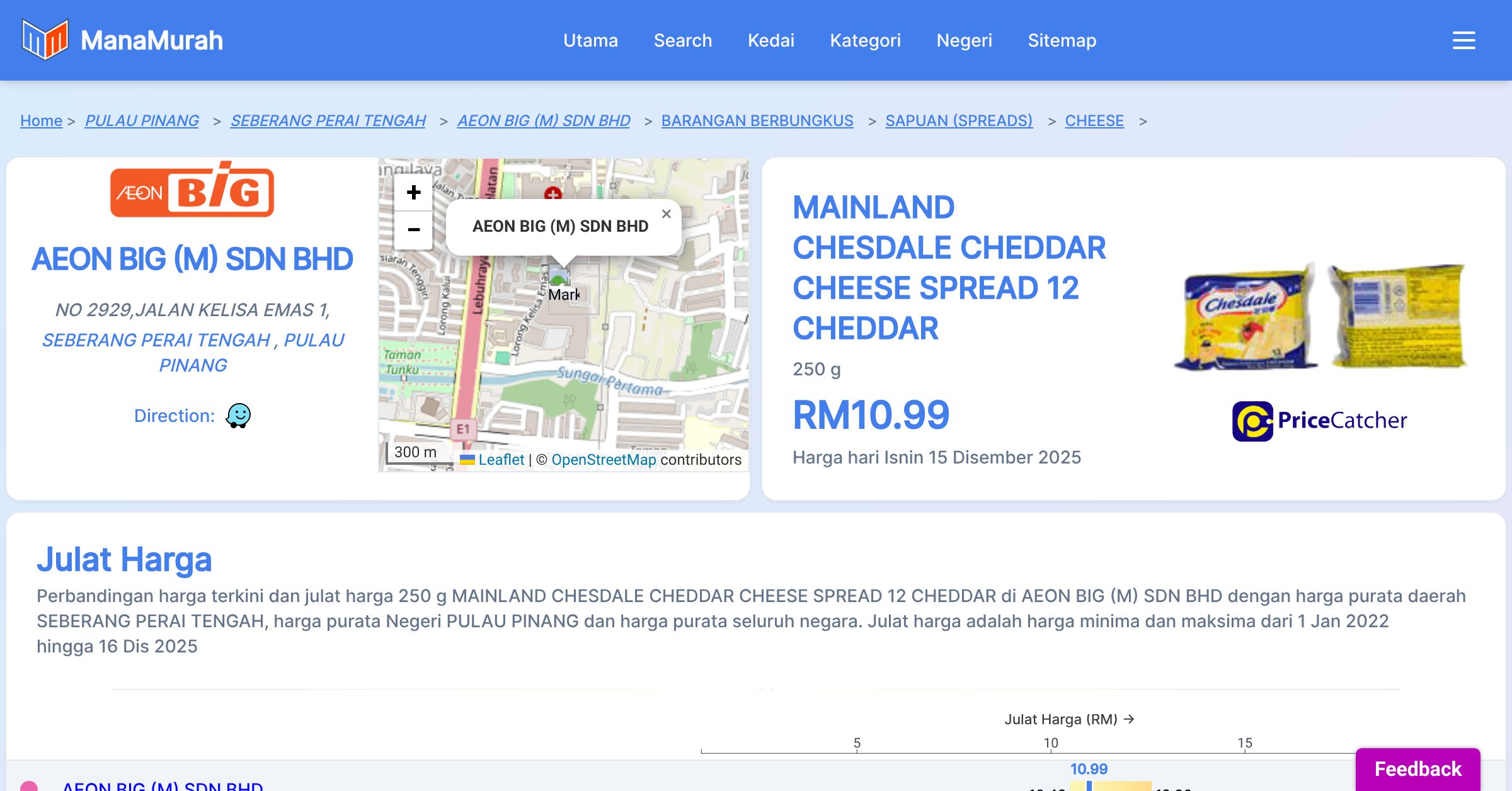 Perubahan harga purata mingguan 250 g MAINLAND CHESDALE CHEDDAR CHEESE SPREAD 12 CHEDDAR di AEON BIG (M) SDN BHD berbanding harga purata mingguan daerah SEBERANG PERAI TENGAH, harga purata mingguan negeri PULAU PINANG dan harga purata mingguan seluruh negara sehingga 16 Dis 2025