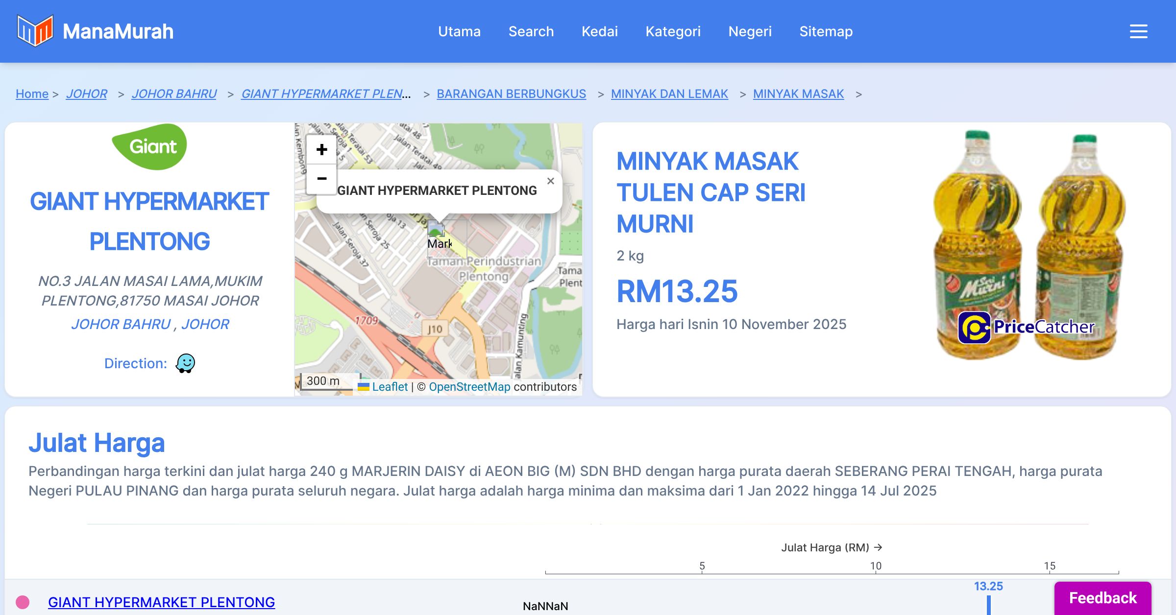 Tiada maklumat harga MINYAK MASAK TULEN CAP SERI MURNI di Daerah JOHOR BAHRU pada minggu ke-46 tahun 2025 dari 10 hingga 13 November