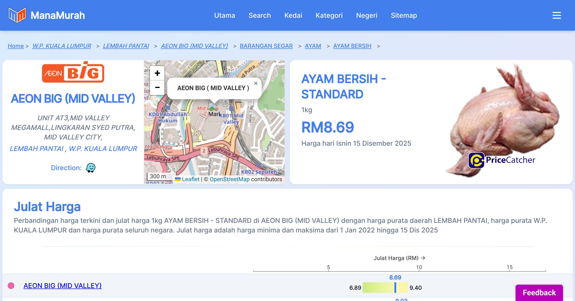 Perbandingan harga terkini dan julat harga 1kg AYAM BERSIH - STANDARD di AEON BIG (MID VALLEY) dengan harga purata daerah LEMBAH PANTAI, harga purata W.P. KUALA LUMPUR dan harga purata seluruh negara. Julat harga adalah harga minima dan maksima dari 1 Jan 2022 hingga 14 Dis 2025