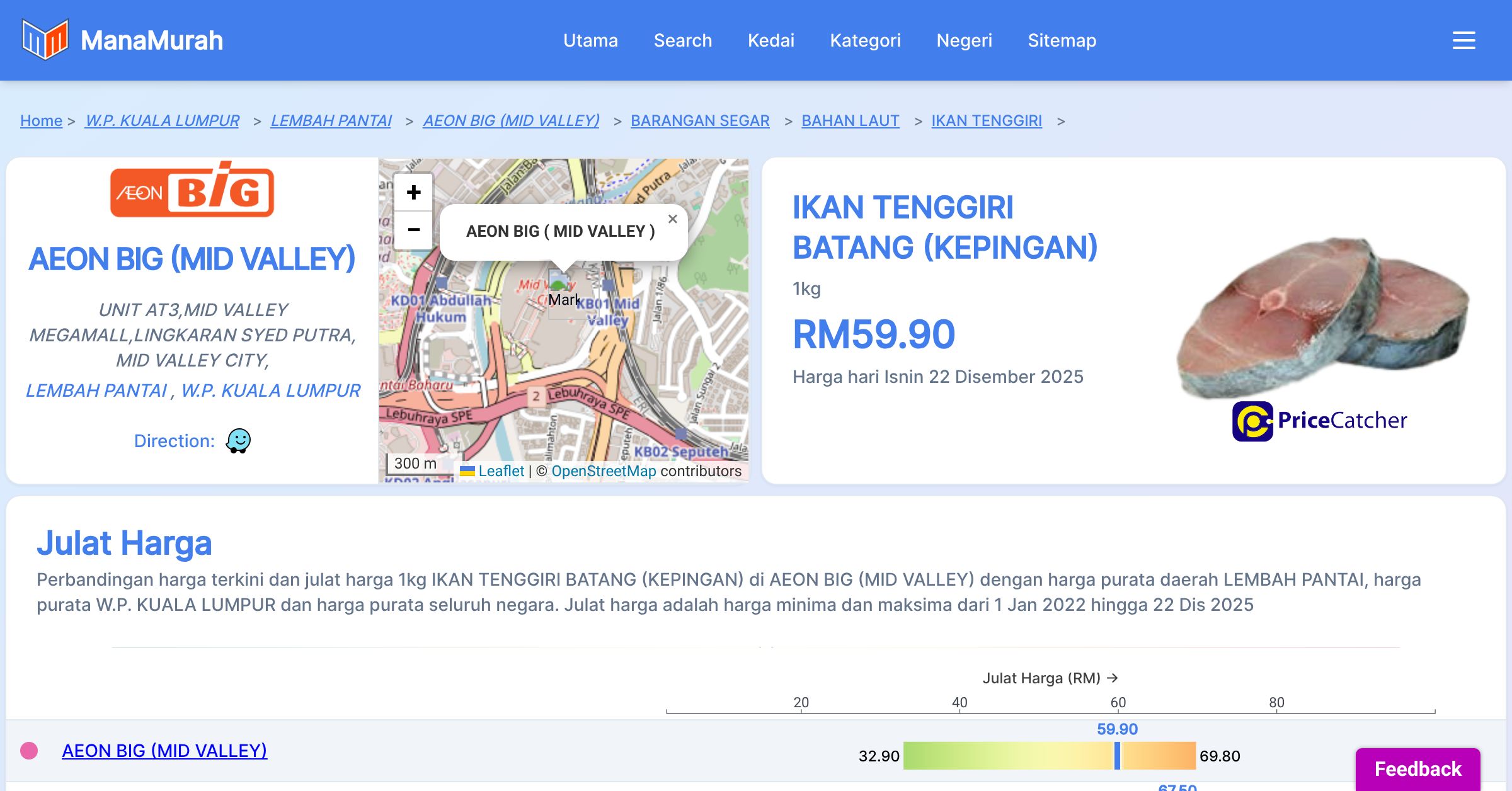 Perbandingan harga terkini dan julat harga 1kg IKAN TENGGIRI BATANG (KEPINGAN) di AEON BIG (MID VALLEY) dengan harga purata daerah LEMBAH PANTAI, harga purata W.P. KUALA LUMPUR dan harga purata seluruh negara. Julat harga adalah harga minima dan maksima dari 1 Jan 2022 hingga 22 Dis 2025