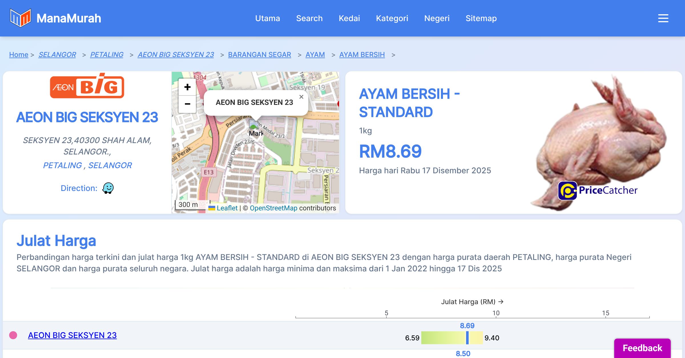 Perbandingan harga terkini dan julat harga 1kg AYAM BERSIH - STANDARD di AEON BIG SEKSYEN 23 dengan harga purata daerah PETALING, harga purata Negeri SELANGOR dan harga purata seluruh negara. Julat harga adalah harga minima dan maksima dari 1 Jan 2022 hingga 17 Dis 2025