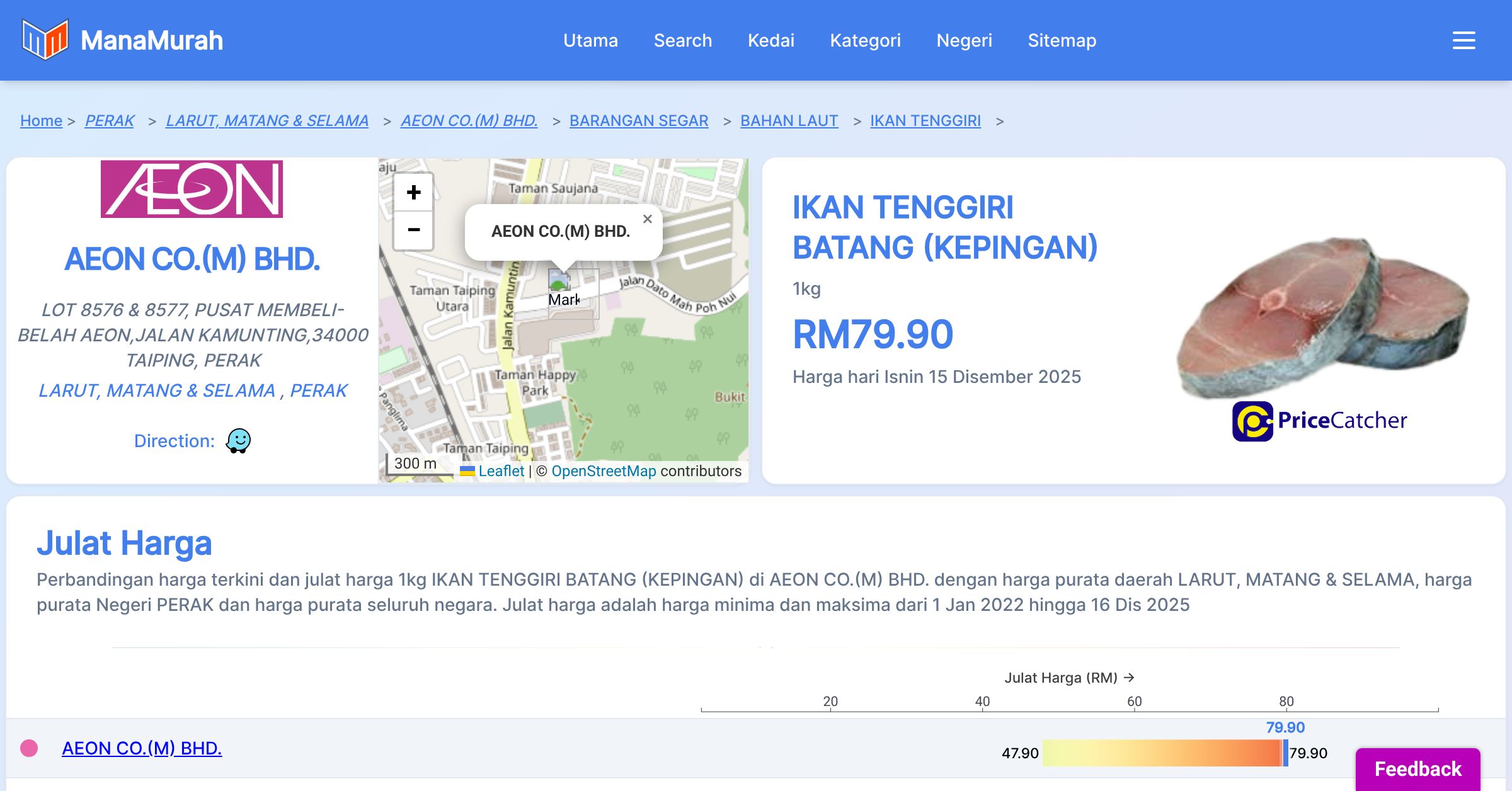 Perbandingan harga terkini dan julat harga 1kg IKAN TENGGIRI BATANG (KEPINGAN) di AEON CO.(M) BHD. dengan harga purata daerah LARUT, MATANG & SELAMA, harga purata Negeri PERAK dan harga purata seluruh negara. Julat harga adalah harga minima dan maksima dari 1 Jan 2022 hingga 16 Dis 2025