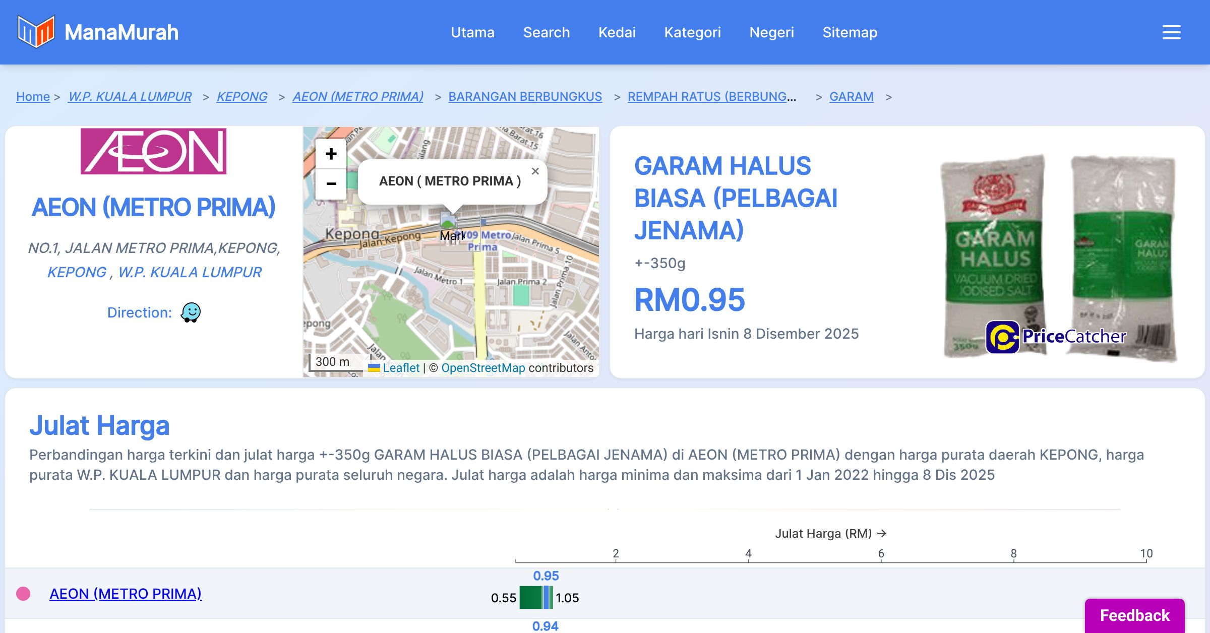 Perubahan harga purata mingguan +-350g GARAM HALUS BIASA (PELBAGAI JENAMA) di AEON ( METRO PRIMA ) berbanding harga purata mingguan daerah KEPONG, harga purata mingguan negeri W.P. KUALA LUMPUR dan harga purata mingguan seluruh negara sehingga 8 Dis 2025