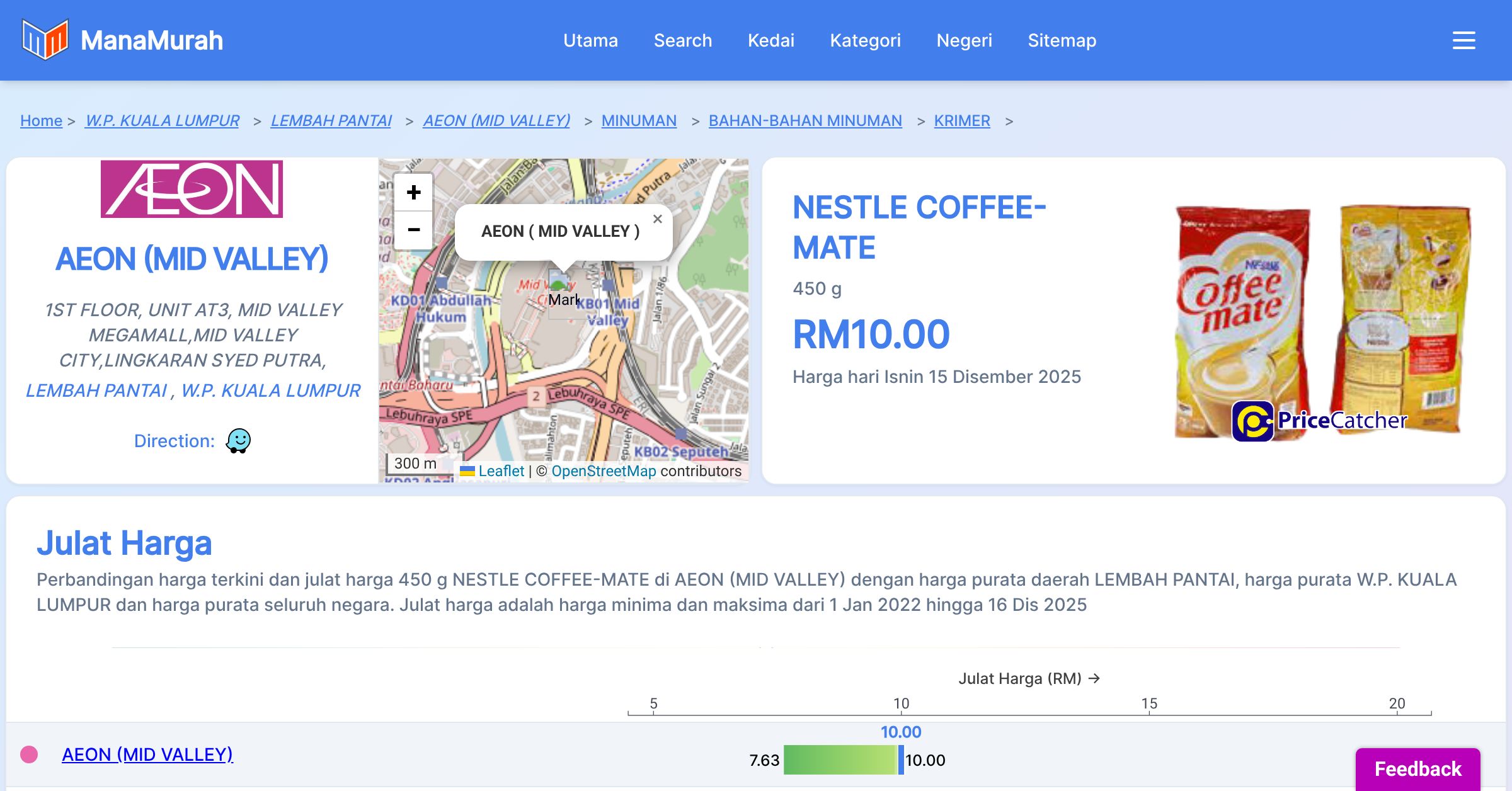 Perubahan harga purata mingguan 450 g NESTLE COFFEE-MATE di AEON ( MID VALLEY ) berbanding harga purata mingguan daerah LEMBAH PANTAI, harga purata mingguan negeri W.P. KUALA LUMPUR dan harga purata mingguan seluruh negara sehingga 16 Dis 2025