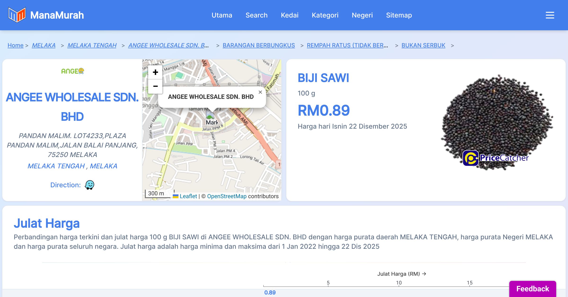 Perubahan harga purata mingguan 100 g BIJI SAWI di ANGEE WHOLESALE SDN. BHD berbanding harga purata mingguan daerah MELAKA TENGAH, harga purata mingguan negeri MELAKA dan harga purata mingguan seluruh negara sehingga 22 Dis 2025