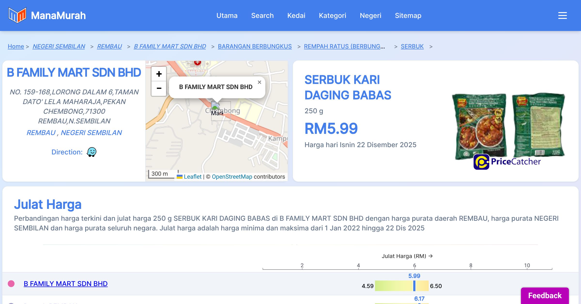 Perubahan harga purata mingguan 250 g SERBUK KARI DAGING BABAS di B FAMILY MART SDN BHD berbanding harga purata mingguan daerah REMBAU, harga purata mingguan negeri NEGERI SEMBILAN dan harga purata mingguan seluruh negara sehingga 22 Dis 2025