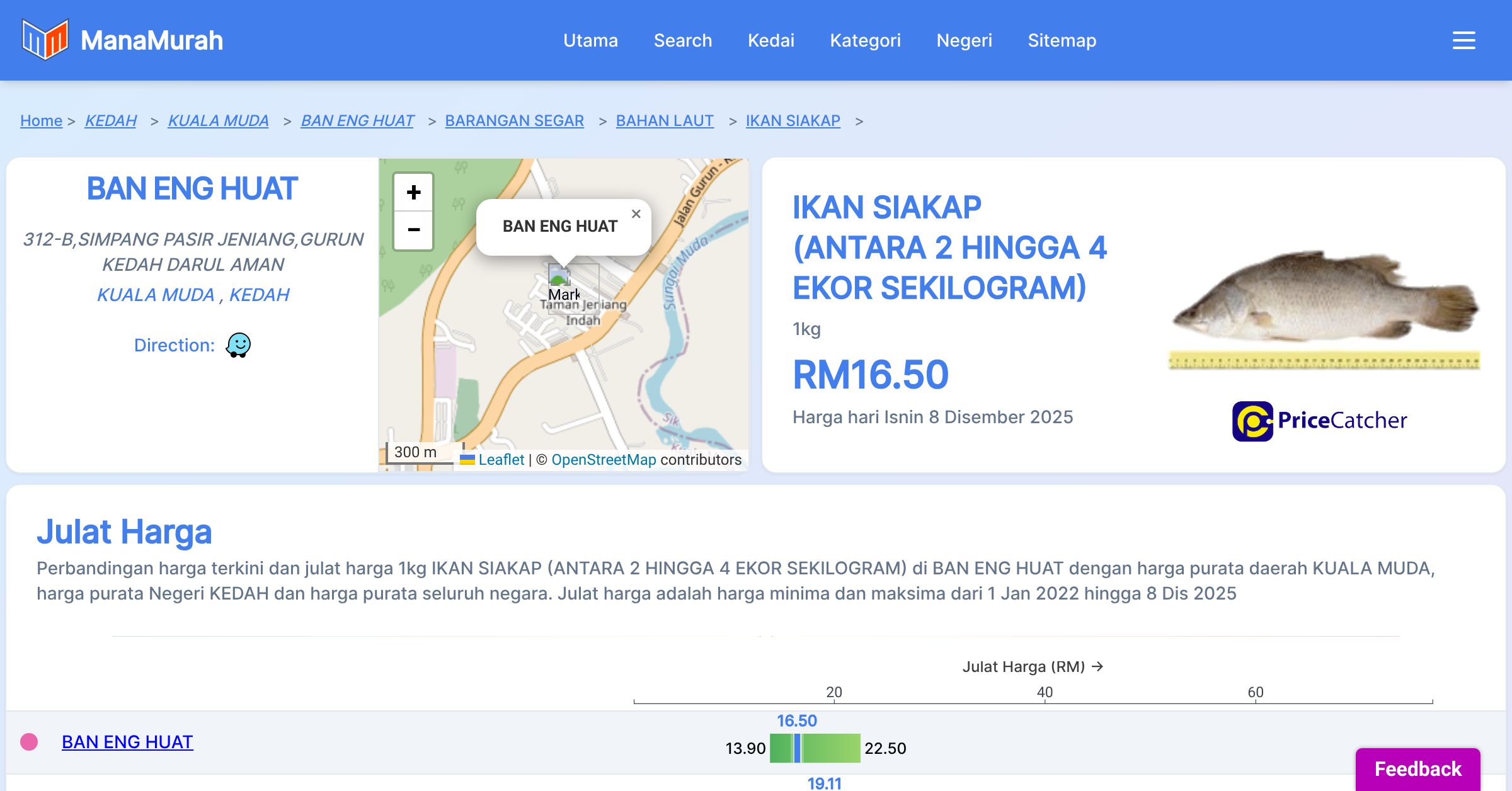 Perbandingan harga terkini dan julat harga 1kg IKAN SIAKAP (ANTARA 2 HINGGA 4 EKOR SEKILOGRAM) di BAN ENG HUAT dengan harga purata daerah KUALA MUDA, harga purata Negeri KEDAH dan harga purata seluruh negara. Julat harga adalah harga minima dan maksima dari 1 Jan 2022 hingga 8 Dis 2025