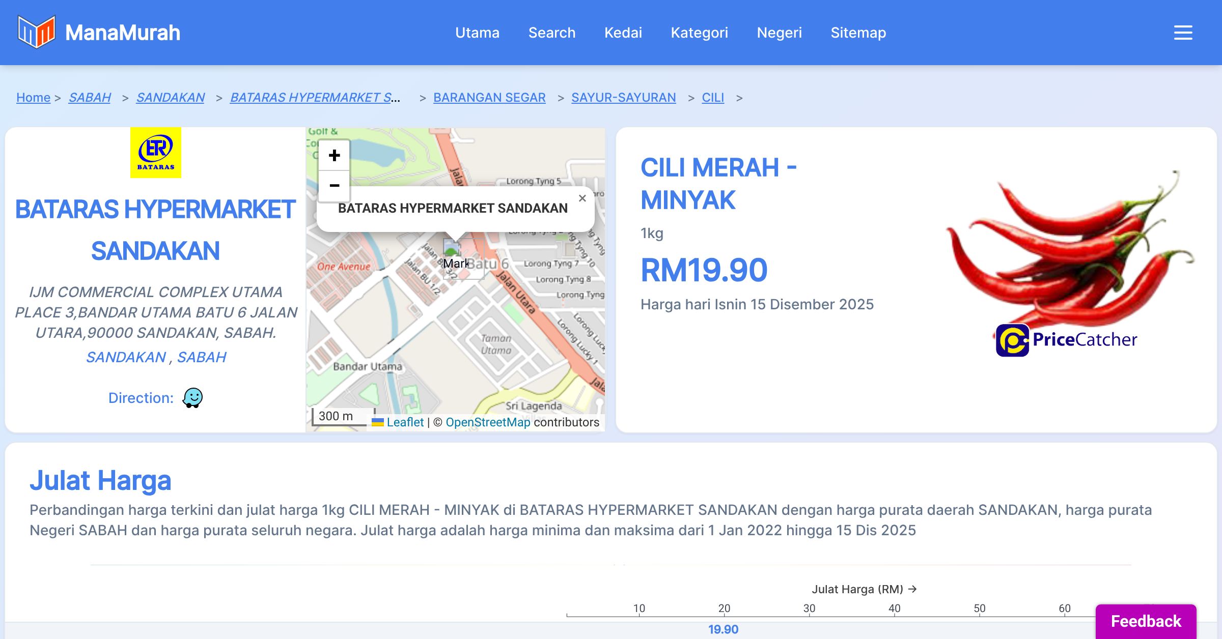 Perubahan harga purata mingguan 1kg CILI MERAH - MINYAK di BATARAS HYPERMARKET SANDAKAN berbanding harga purata mingguan daerah SANDAKAN, harga purata mingguan negeri SABAH dan harga purata mingguan seluruh negara sehingga 15 Dis 2025