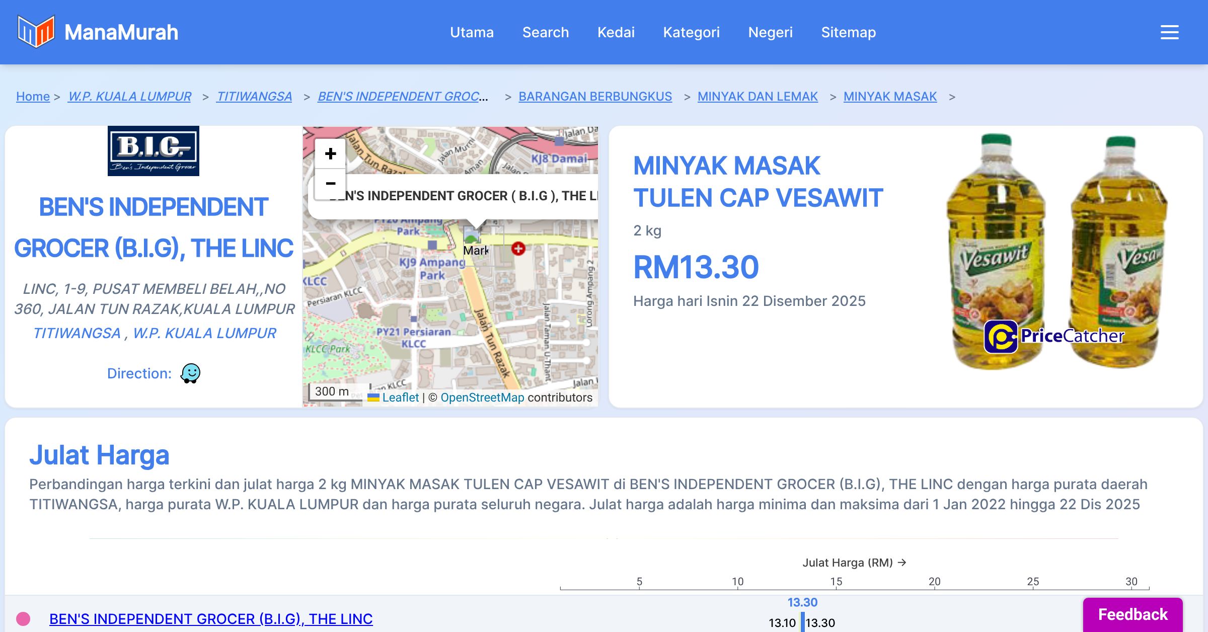 Perubahan harga purata mingguan 2 kg MINYAK MASAK TULEN CAP VESAWIT di BEN'S INDEPENDENT GROCER ( B.I.G ), THE LINC berbanding harga purata mingguan daerah TITIWANGSA, harga purata mingguan negeri W.P. KUALA LUMPUR dan harga purata mingguan seluruh negara sehingga 22 Dis 2025