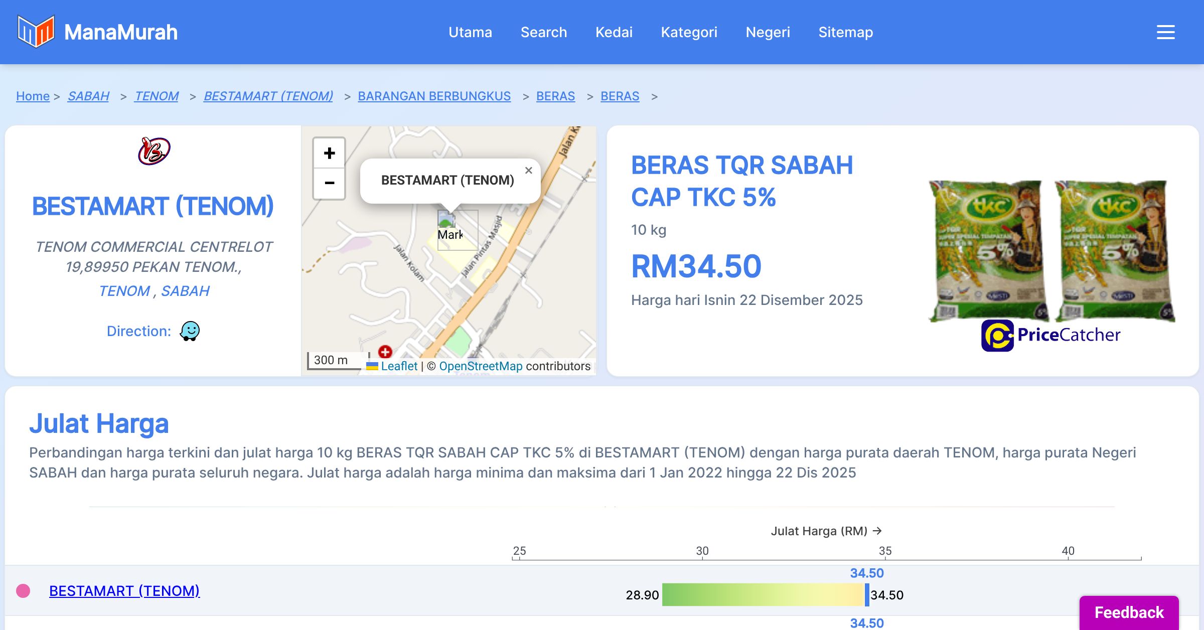 Perbandingan harga terkini dan julat harga 10 kg BERAS TQR SABAH CAP TKC 5% di BESTAMART (TENOM) dengan harga purata daerah TENOM, harga purata Negeri SABAH dan harga purata seluruh negara. Julat harga adalah harga minima dan maksima dari 1 Jan 2022 hingga 22 Dis 2025