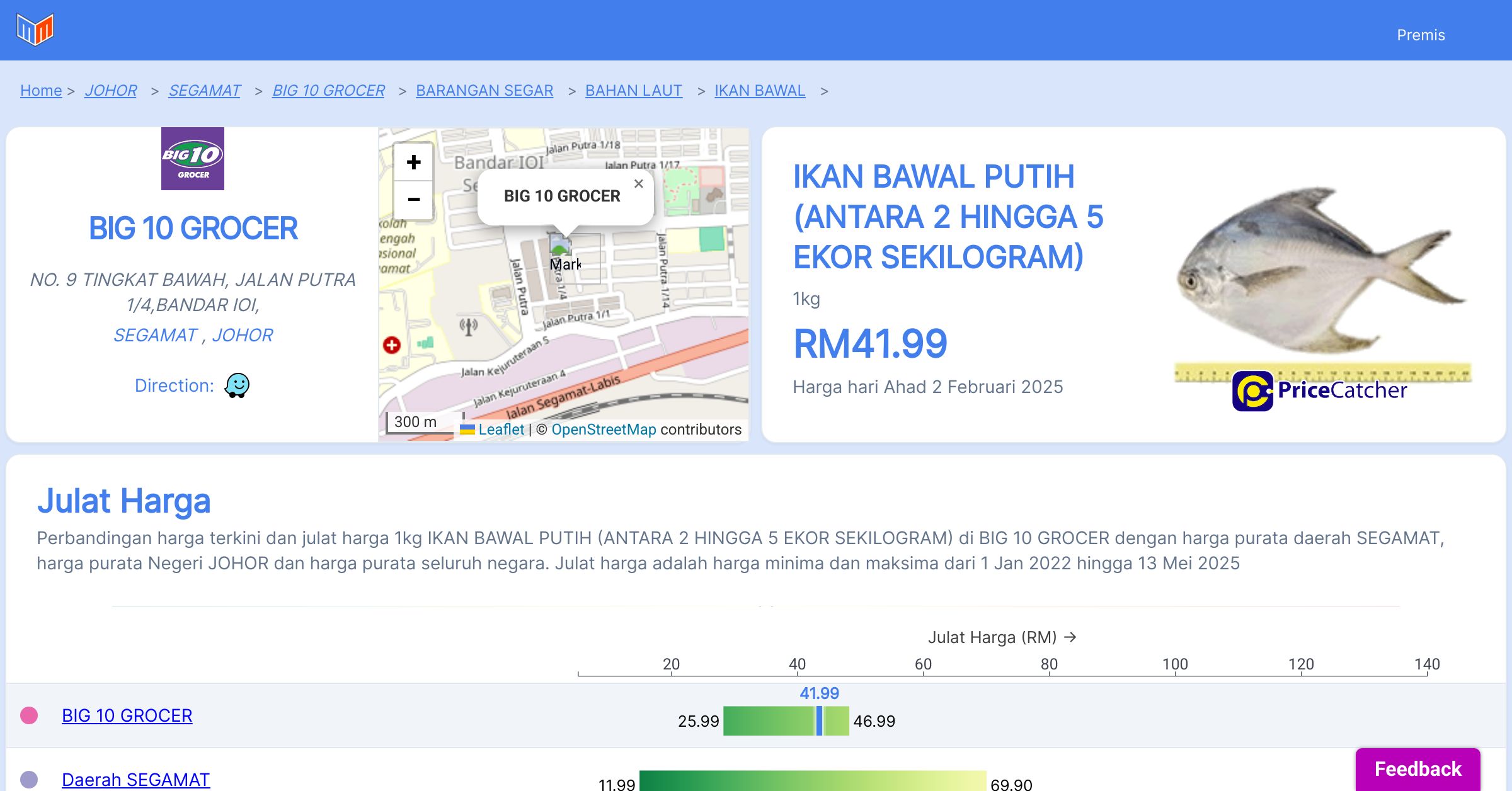 Perbandingan harga terkini dan julat harga 1kg IKAN BAWAL PUTIH (ANTARA 2 HINGGA 5 EKOR SEKILOGRAM) di BIG 10 GROCER dengan harga purata daerah SEGAMAT, harga purata Negeri JOHOR dan harga purata seluruh negara. Julat harga adalah harga minima dan maksima dari 1 Jan 2022 hingga 16 Dis 2025