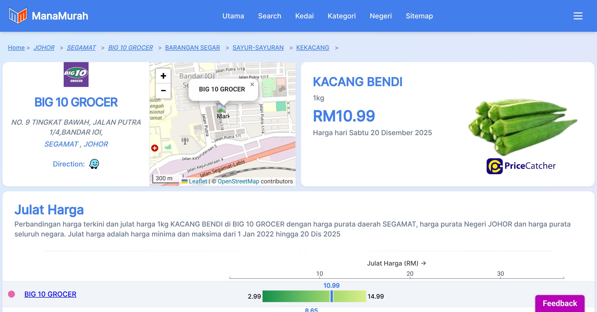 Perbandingan harga terkini dan julat harga 1kg KACANG BENDI di BIG 10 GROCER dengan harga purata daerah SEGAMAT, harga purata Negeri JOHOR dan harga purata seluruh negara. Julat harga adalah harga minima dan maksima dari 1 Jan 2022 hingga 20 Dis 2025