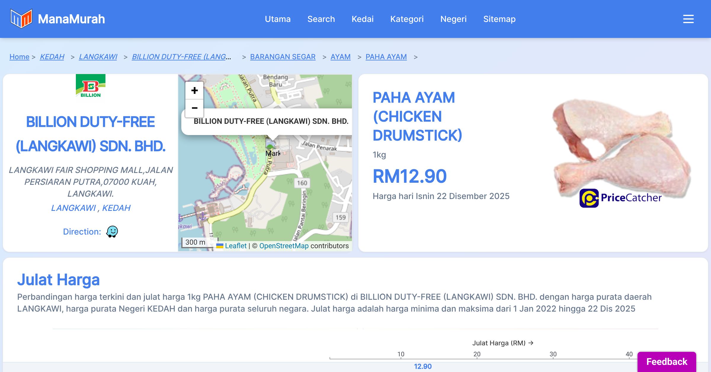 Perbandingan harga terkini dan julat harga 1kg PAHA AYAM (CHICKEN DRUMSTICK) di BILLION DUTY-FREE (LANGKAWI) SDN. BHD. dengan harga purata daerah LANGKAWI, harga purata Negeri KEDAH dan harga purata seluruh negara. Julat harga adalah harga minima dan maksima dari 1 Jan 2022 hingga 22 Dis 2025