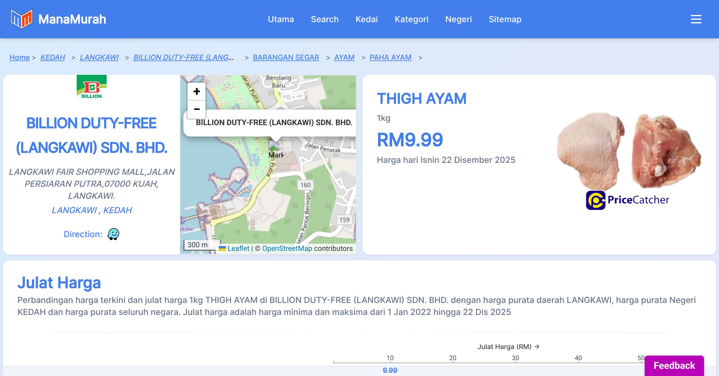 Perbandingan harga terkini dan julat harga 1kg THIGH AYAM di BILLION DUTY-FREE (LANGKAWI) SDN. BHD. dengan harga purata daerah LANGKAWI, harga purata Negeri KEDAH dan harga purata seluruh negara. Julat harga adalah harga minima dan maksima dari 1 Jan 2022 hingga 22 Dis 2025