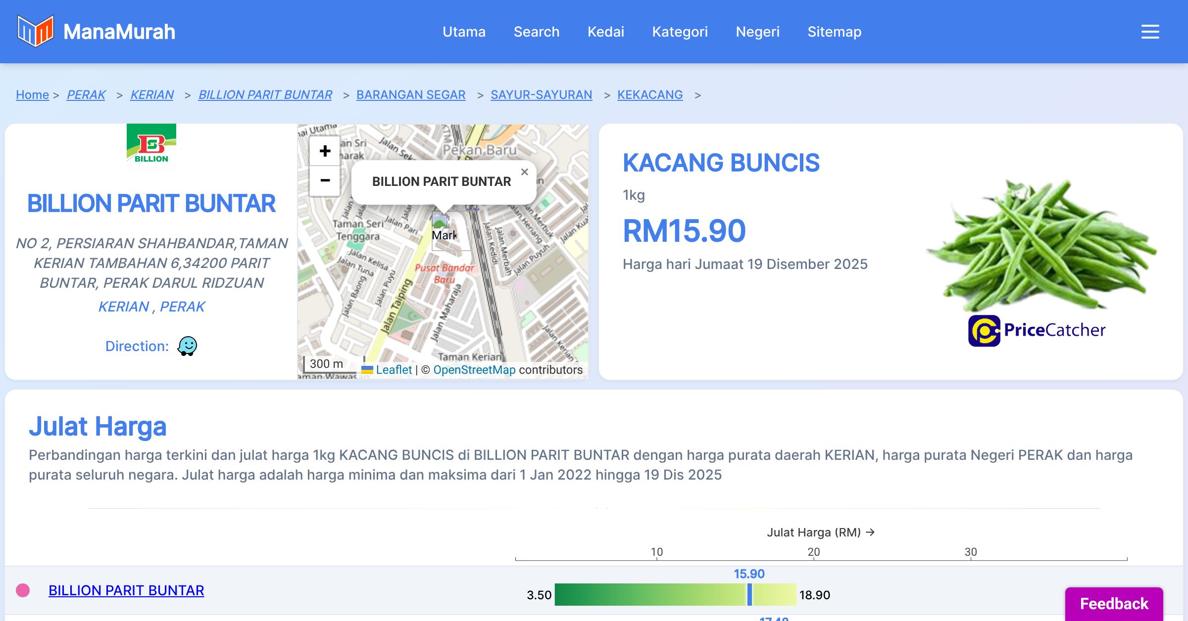 Perbandingan harga terkini dan julat harga 1kg KACANG BUNCIS di BILLION PARIT BUNTAR dengan harga purata daerah KERIAN, harga purata Negeri PERAK dan harga purata seluruh negara. Julat harga adalah harga minima dan maksima dari 1 Jan 2022 hingga 18 Dis 2025