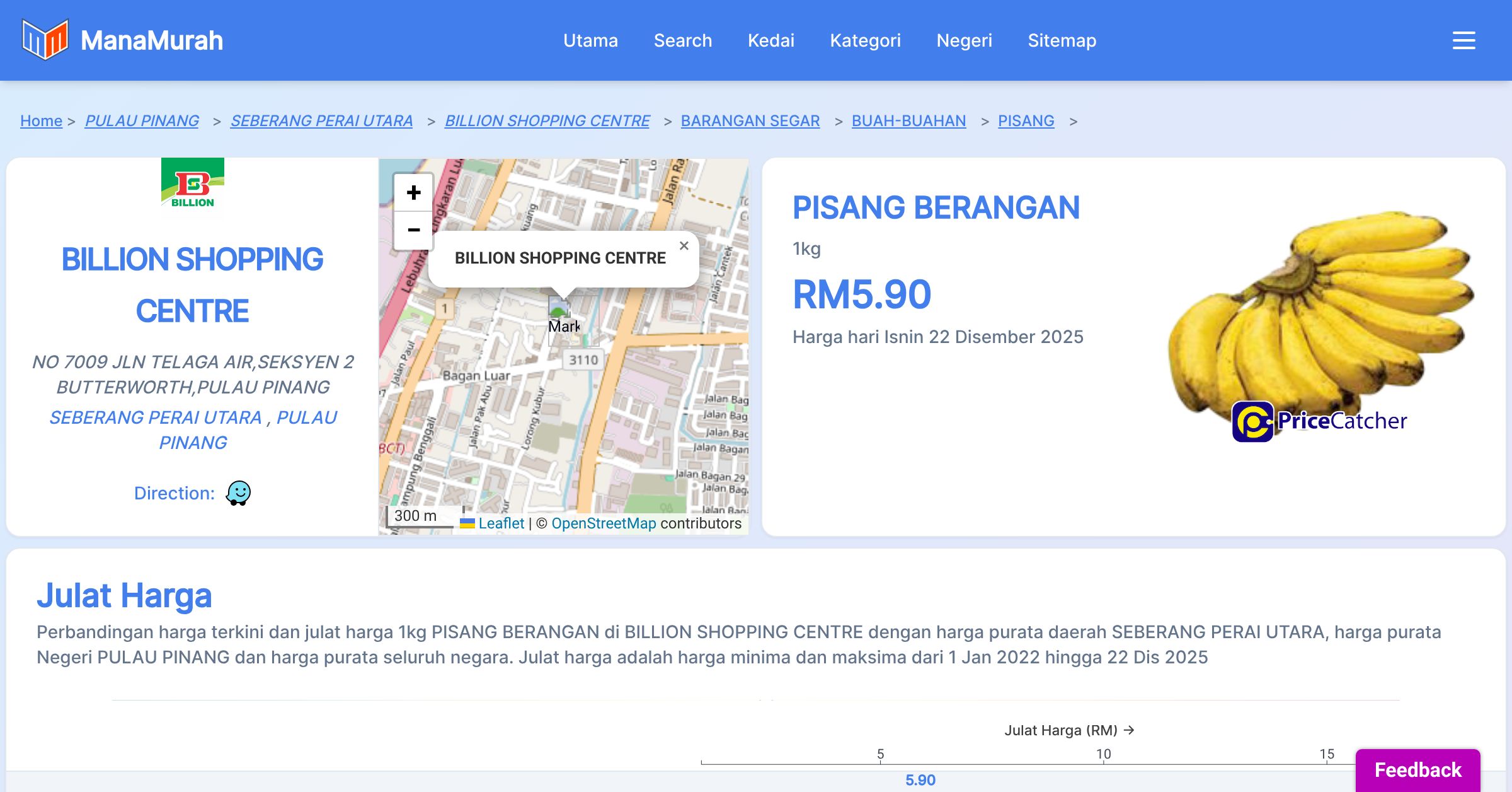 Perbandingan harga terkini dan julat harga 1kg PISANG BERANGAN di BILLION SHOPPING CENTRE dengan harga purata daerah SEBERANG PERAI UTARA, harga purata Negeri PULAU PINANG dan harga purata seluruh negara. Julat harga adalah harga minima dan maksima dari 1 Jan 2022 hingga 22 Dis 2025