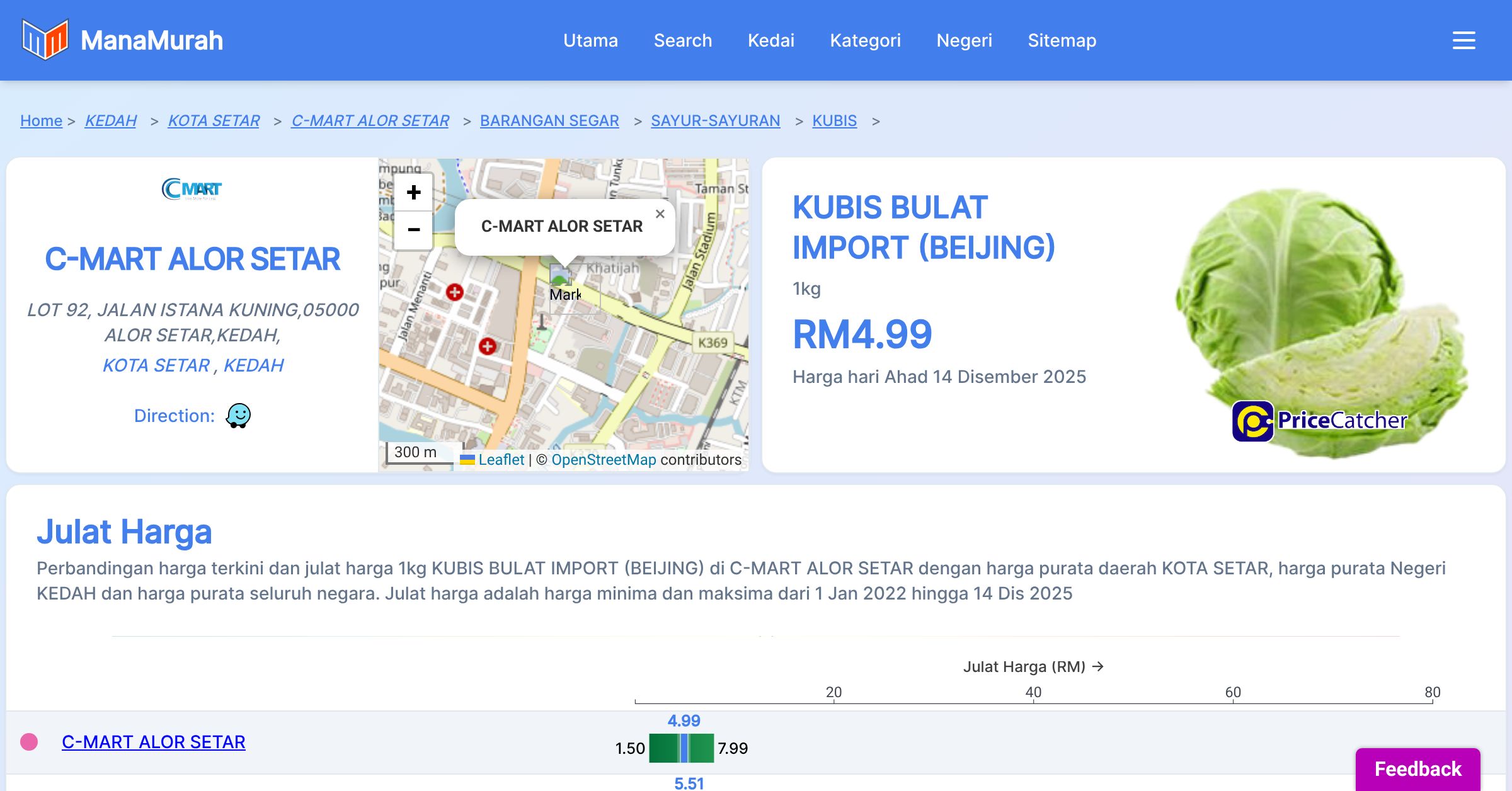 Harga purata mingguan 1kg KUBIS BULAT IMPORT (BEIJING) di C-MART ALOR SETAR berbanding harga purata daerah KOTA SETAR, harga purata Negeri KEDAH dan harga purata seluruh negara
