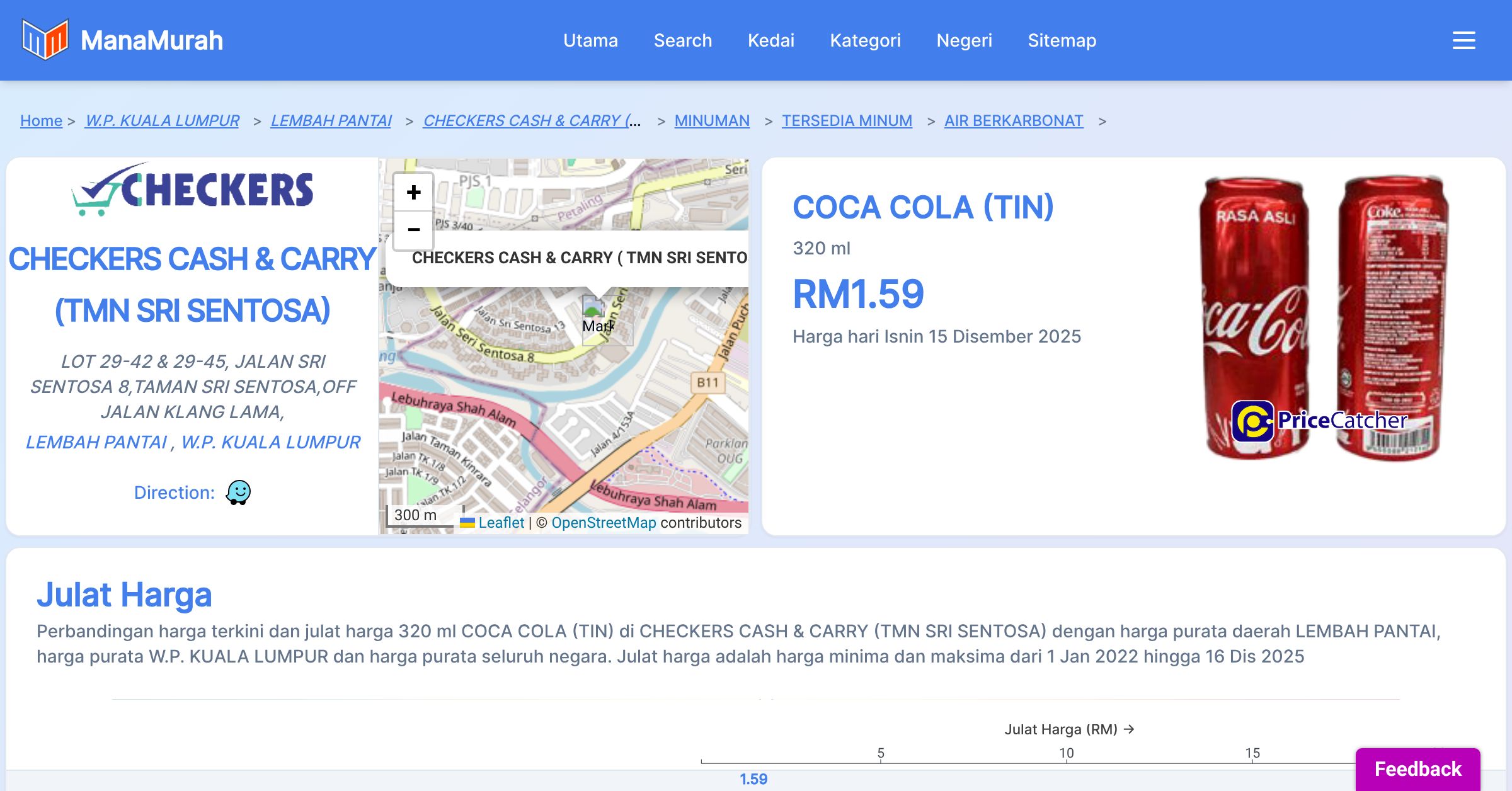 Perbandingan harga terkini dan julat harga 320 ml COCA COLA (TIN) di CHECKERS CASH & CARRY (TMN SRI SENTOSA) dengan harga purata daerah LEMBAH PANTAI, harga purata W.P. KUALA LUMPUR dan harga purata seluruh negara. Julat harga adalah harga minima dan maksima dari 1 Jan 2022 hingga 16 Dis 2025