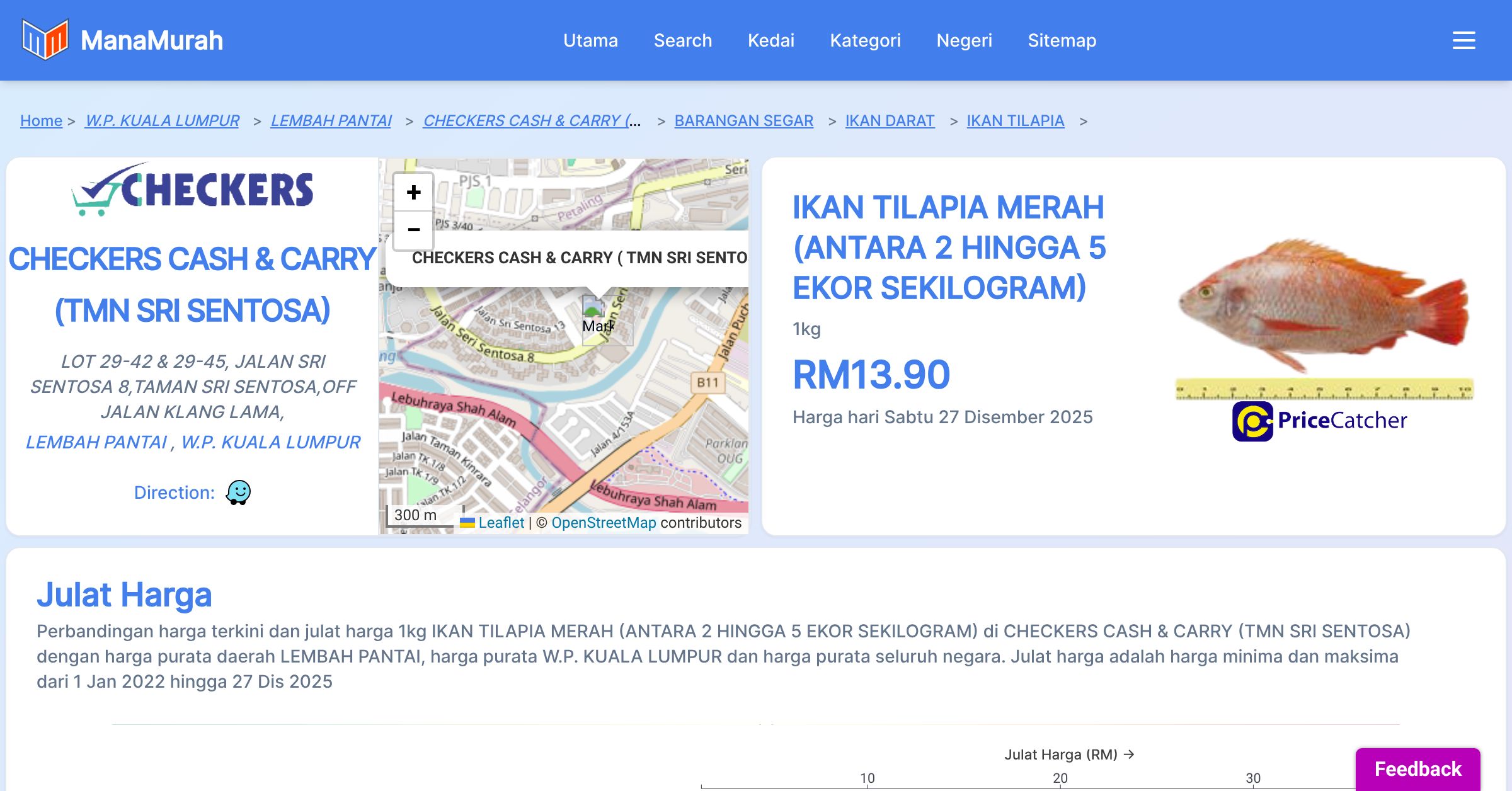 Perbandingan harga terkini dan julat harga 1kg IKAN TILAPIA MERAH (ANTARA 2 HINGGA 5 EKOR SEKILOGRAM) di CHECKERS CASH & CARRY (TMN SRI SENTOSA) dengan harga purata daerah LEMBAH PANTAI, harga purata W.P. KUALA LUMPUR dan harga purata seluruh negara. Julat harga adalah harga minima dan maksima dari 1 Jan 2022 hingga 27 Dis 2025