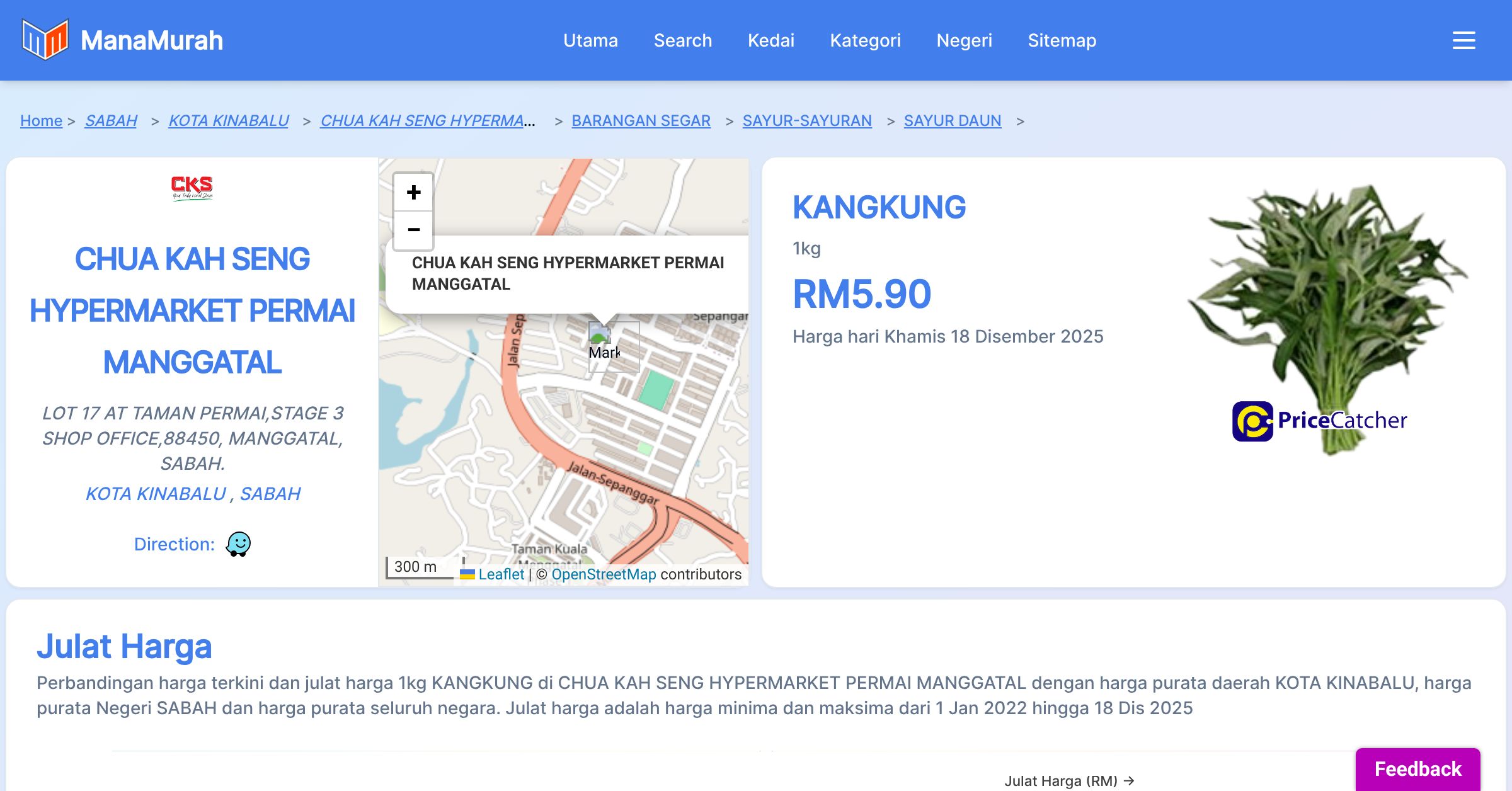 Harga purata tahunan 1kg KANGKUNG di CHUA KAH SENG HYPERMARKET PERMAI MANGGATAL berbanding harga purata daerah KOTA KINABALU, harga purata Negeri SABAH dan harga purata seluruh negara