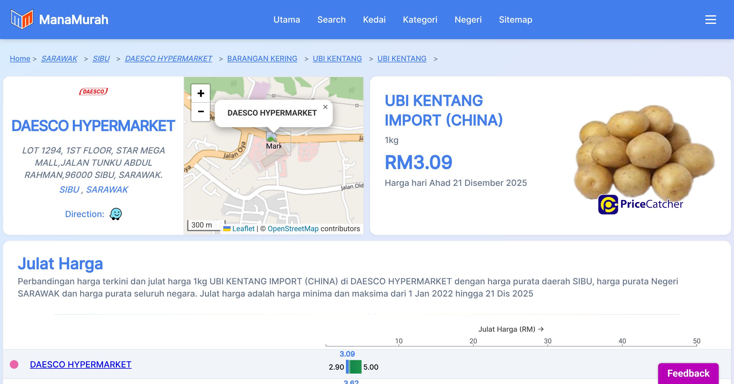 Perbandingan harga terkini dan julat harga 1kg UBI KENTANG IMPORT (CHINA) di DAESCO HYPERMARKET dengan harga purata daerah SIBU, harga purata Negeri SARAWAK dan harga purata seluruh negara. Julat harga adalah harga minima dan maksima dari 1 Jan 2022 hingga 21 Dis 2025
