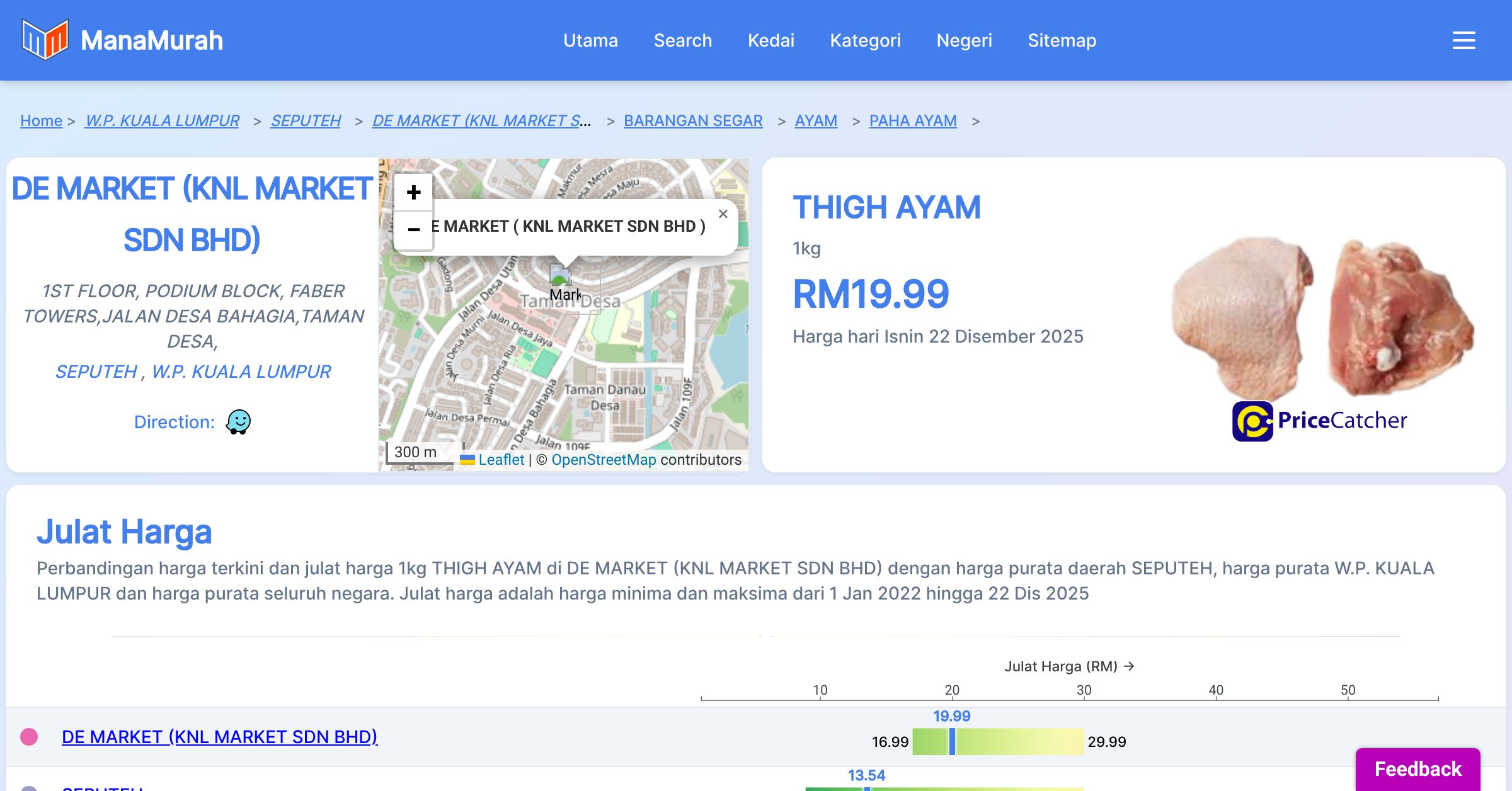 Perubahan harga purata mingguan 1kg THIGH AYAM di DE MARKET ( KNL MARKET SDN BHD ) berbanding harga purata mingguan daerah SEPUTEH, harga purata mingguan negeri W.P. KUALA LUMPUR dan harga purata mingguan seluruh negara sehingga 22 Dis 2025
