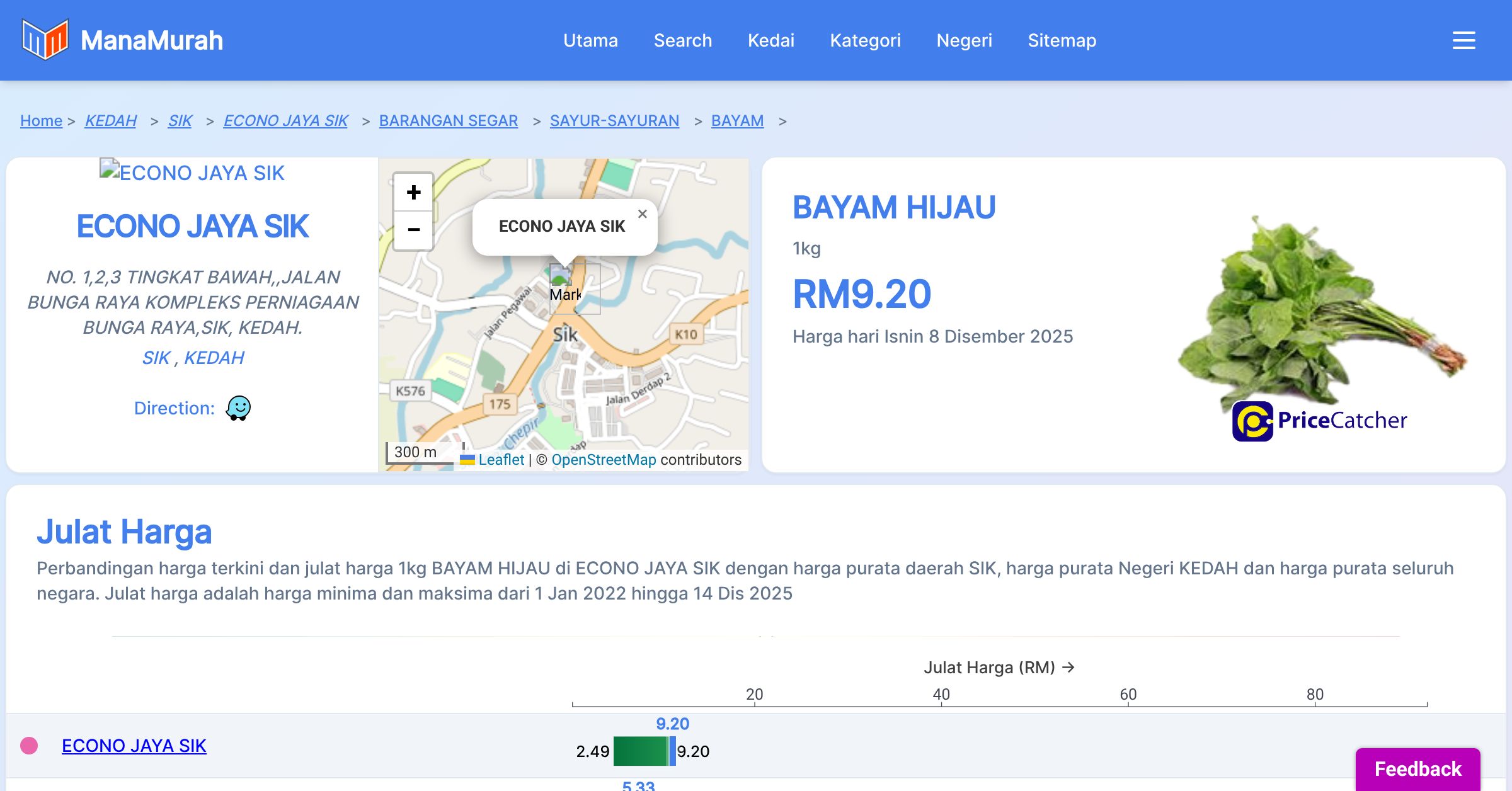 Perbandingan harga terkini dan julat harga 1kg BAYAM HIJAU di ECONO JAYA SIK dengan harga purata daerah SIK, harga purata Negeri KEDAH dan harga purata seluruh negara. Julat harga adalah harga minima dan maksima dari 1 Jan 2022 hingga 14 Dis 2025