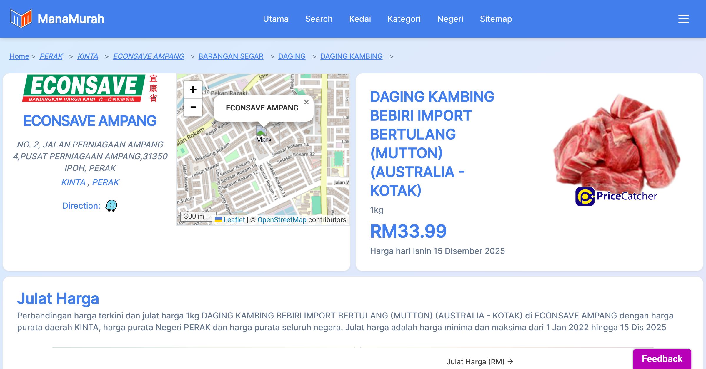 Perbandingan harga terkini dan julat harga 1kg DAGING KAMBING BEBIRI IMPORT BERTULANG (MUTTON) (AUSTRALIA - KOTAK) di ECONSAVE AMPANG dengan harga purata daerah KINTA, harga purata Negeri PERAK dan harga purata seluruh negara. Julat harga adalah harga minima dan maksima dari 1 Jan 2022 hingga 14 Dis 2025