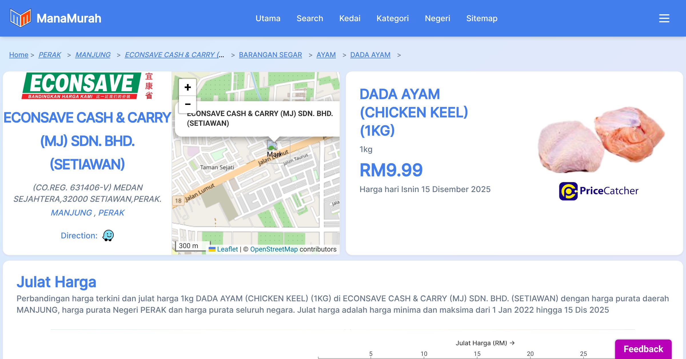 Perubahan harga purata mingguan 1kg DADA AYAM (CHICKEN KEEL) (1KG) di ECONSAVE CASH & CARRY (MJ) SDN. BHD. (SETIAWAN) berbanding harga purata mingguan daerah MANJUNG, harga purata mingguan negeri PERAK dan harga purata mingguan seluruh negara sehingga 15 Dis 2025