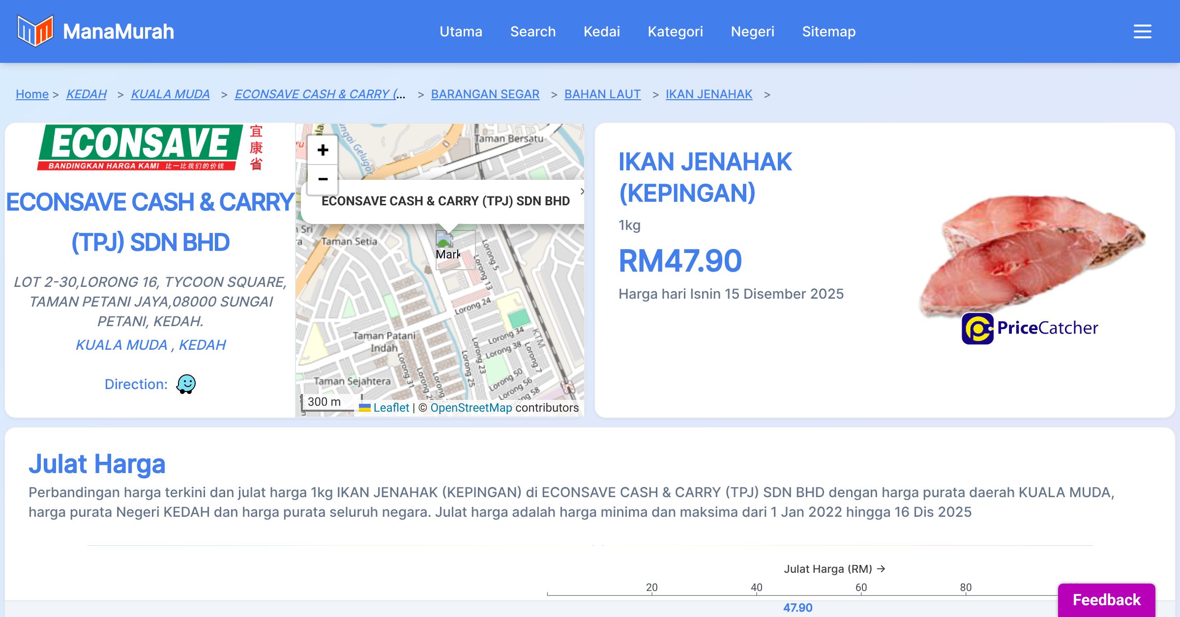 Perbandingan harga terkini dan julat harga 1kg IKAN JENAHAK (KEPINGAN) di ECONSAVE CASH & CARRY (TPJ) SDN BHD dengan harga purata daerah KUALA MUDA, harga purata Negeri KEDAH dan harga purata seluruh negara. Julat harga adalah harga minima dan maksima dari 1 Jan 2022 hingga 16 Dis 2025