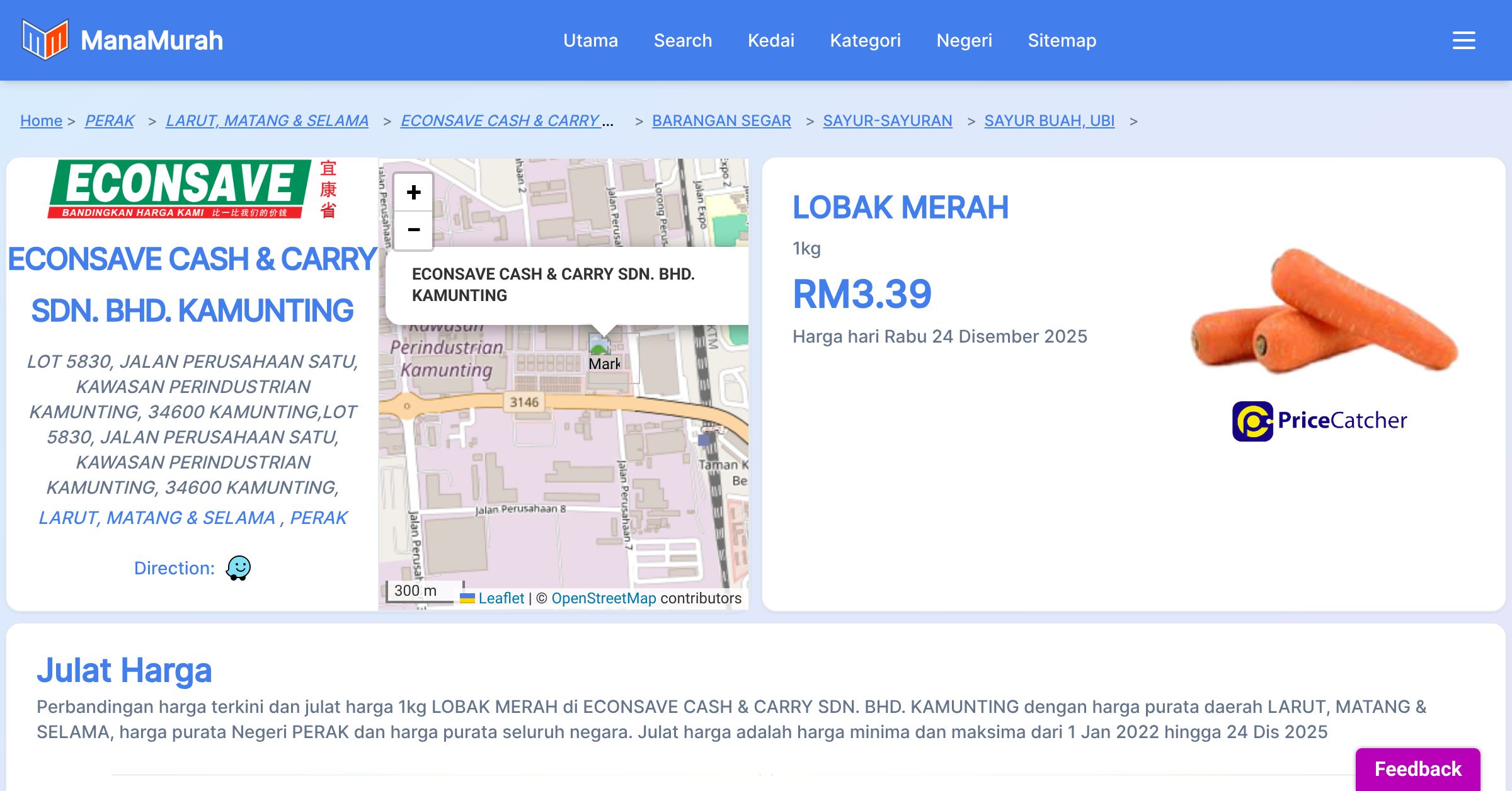 Perubahan harga purata mingguan 1kg LOBAK MERAH di ECONSAVE CASH & CARRY SDN. BHD. KAMUNTING berbanding harga purata mingguan daerah LARUT, MATANG & SELAMA, harga purata mingguan negeri PERAK dan harga purata mingguan seluruh negara sehingga 24 Dis 2025