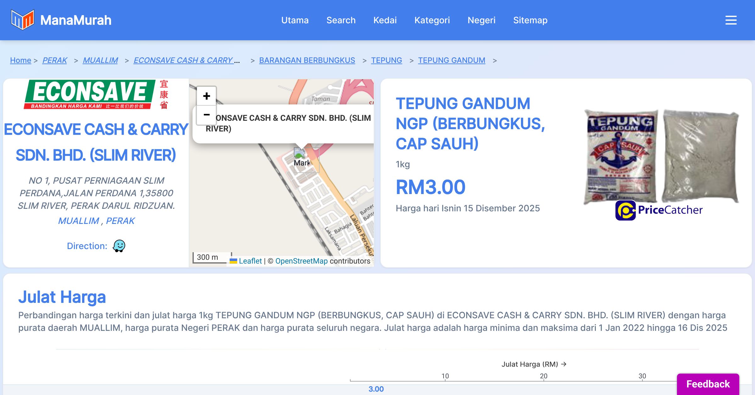 Perubahan harga purata mingguan 1kg TEPUNG GANDUM NGP (BERBUNGKUS, CAP SAUH) di ECONSAVE CASH & CARRY SDN. BHD. (SLIM RIVER) berbanding harga purata mingguan daerah MUALLIM, harga purata mingguan negeri PERAK dan harga purata mingguan seluruh negara sehingga 16 Dis 2025