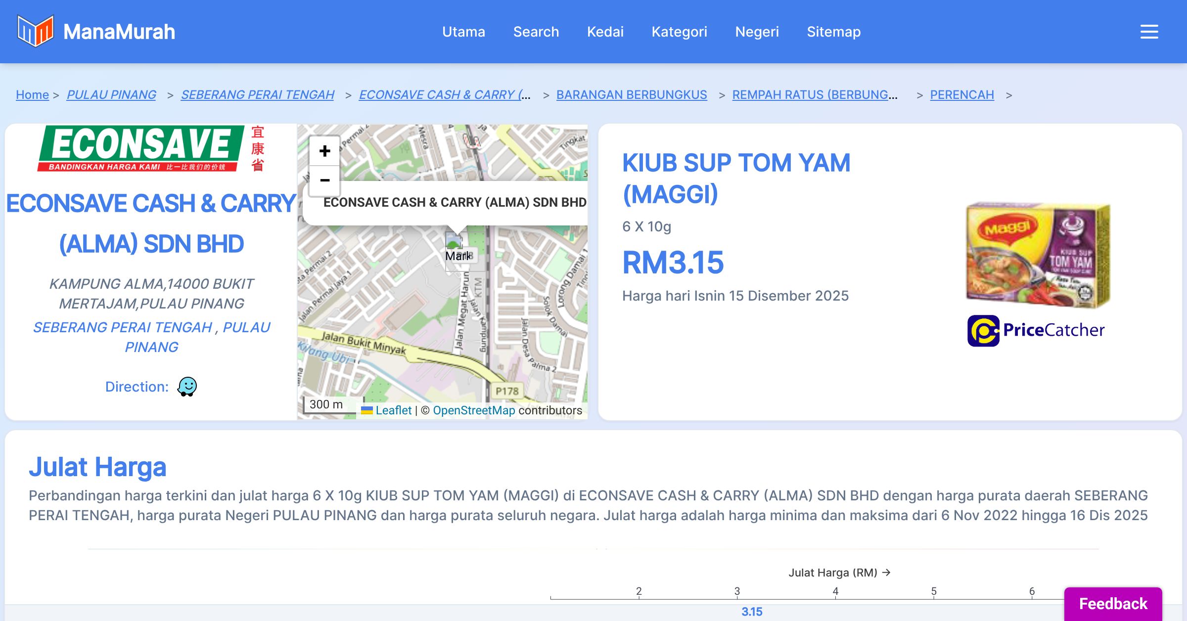 Perubahan harga purata mingguan 6 X 10g KIUB SUP TOM YAM (MAGGI) di ECONSAVE CASH & CARRY (ALMA) SDN BHD berbanding harga purata mingguan daerah SEBERANG PERAI TENGAH, harga purata mingguan negeri PULAU PINANG dan harga purata mingguan seluruh negara sehingga 16 Dis 2025