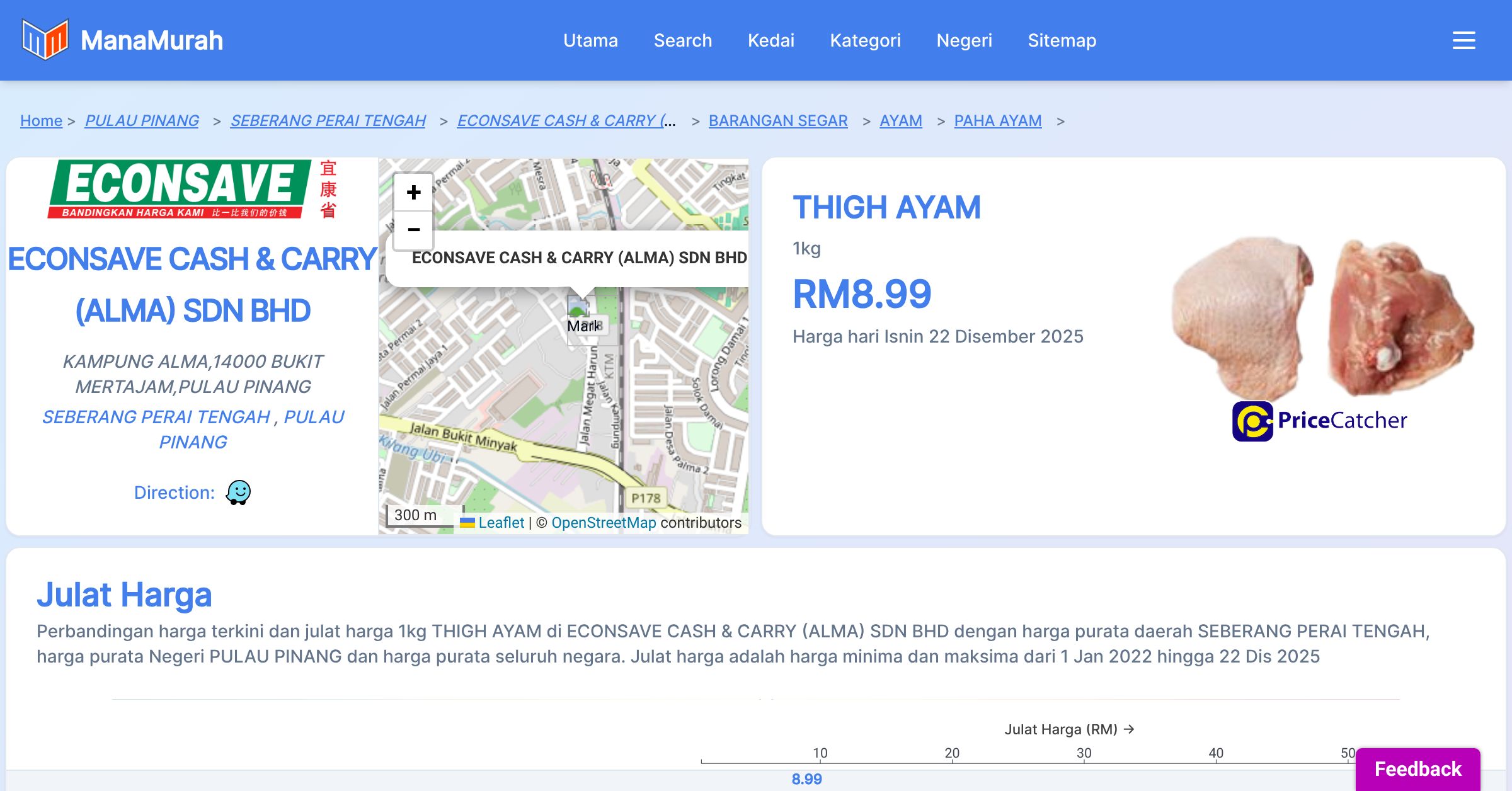 Perubahan harga purata mingguan 1kg THIGH AYAM di ECONSAVE CASH & CARRY (ALMA) SDN BHD berbanding harga purata mingguan daerah SEBERANG PERAI TENGAH, harga purata mingguan negeri PULAU PINANG dan harga purata mingguan seluruh negara sehingga 22 Dis 2025
