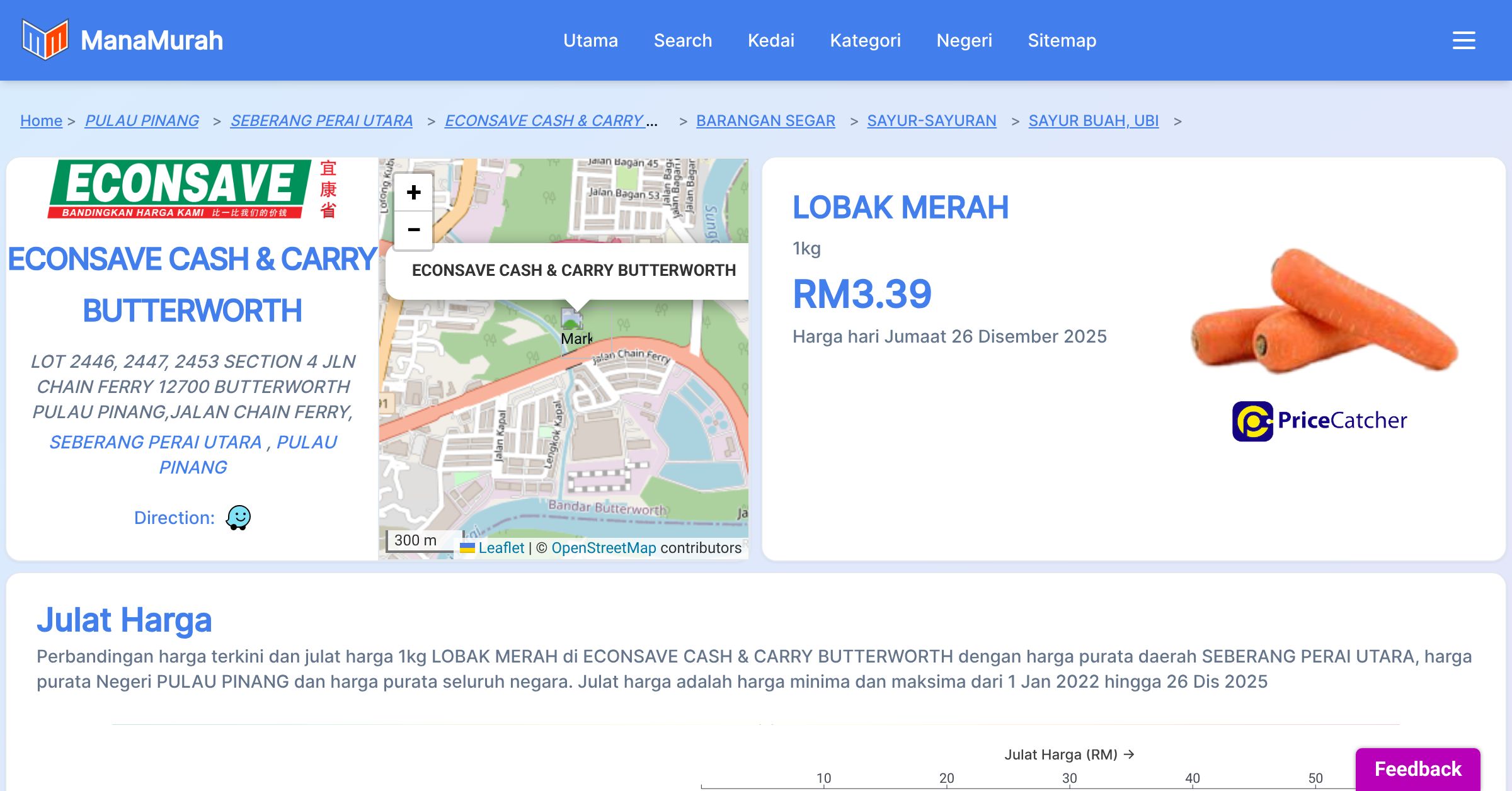 Perubahan harga purata mingguan 1kg LOBAK MERAH di ECONSAVE CASH & CARRY BUTTERWORTH berbanding harga purata mingguan daerah SEBERANG PERAI UTARA, harga purata mingguan negeri PULAU PINANG dan harga purata mingguan seluruh negara sehingga 26 Dis 2025