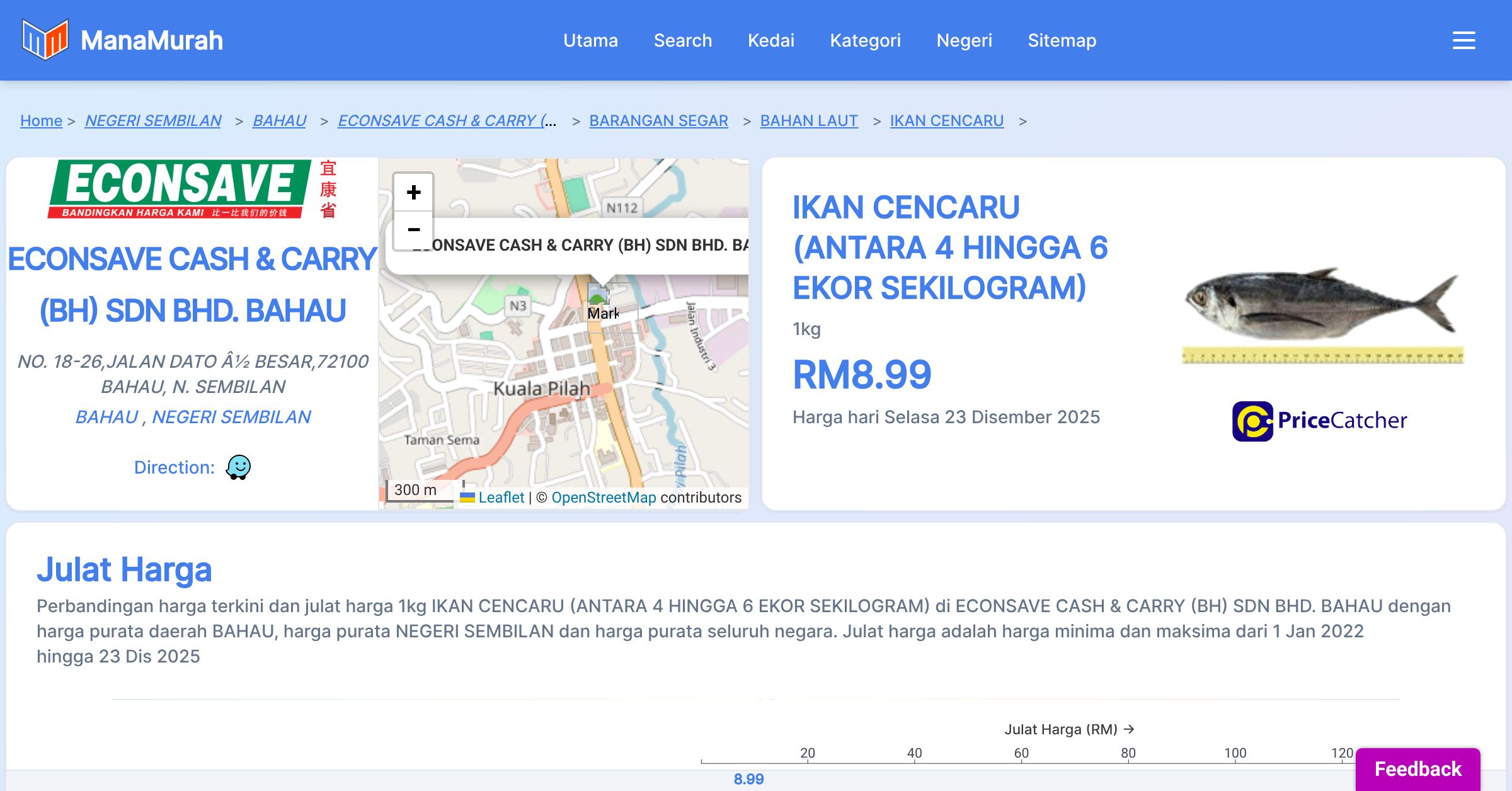 Perubahan harga purata mingguan 1kg IKAN CENCARU (ANTARA 4 HINGGA 6 EKOR SEKILOGRAM) di ECONSAVE CASH & CARRY (BH) SDN BHD. BAHAU berbanding harga purata mingguan daerah BAHAU, harga purata mingguan negeri NEGERI SEMBILAN dan harga purata mingguan seluruh negara sehingga 23 Dis 2025