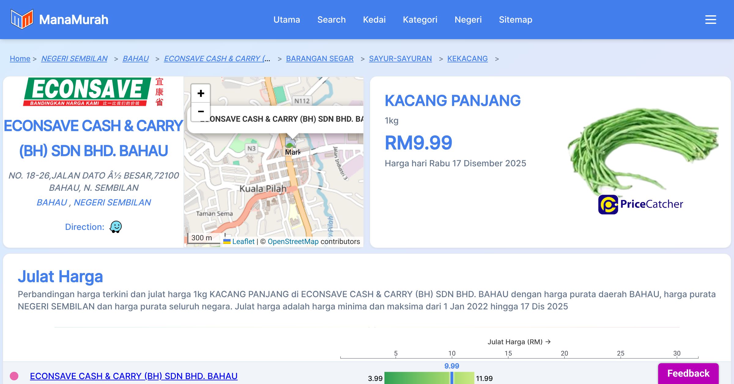 Perbandingan harga terkini dan julat harga 1kg KACANG PANJANG di ECONSAVE CASH & CARRY (BH) SDN BHD. BAHAU dengan harga purata daerah BAHAU, harga purata NEGERI SEMBILAN dan harga purata seluruh negara. Julat harga adalah harga minima dan maksima dari 1 Jan 2022 hingga 17 Dis 2025